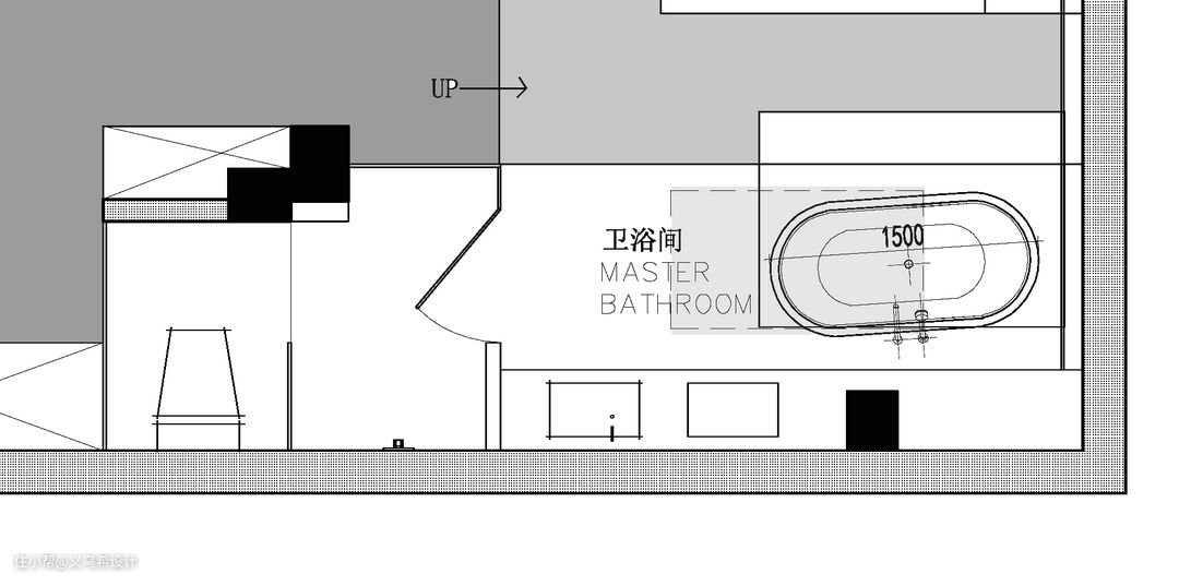 主卫生间,分成内外两个部分。 外面是洗漱区和浴缸,里面是马桶和淋浴间。由于坡屋顶的梁柱构造复杂,梳妆台和洗手台放在靠天窗位置,沿墙做了一个3.5米长的整体洗漱台,左侧留足梳妆台位置,下方安排了足够的收纳柜体,这样台面上不会被过多的物品覆盖,同时也会在日常使用中比较清爽整洁。