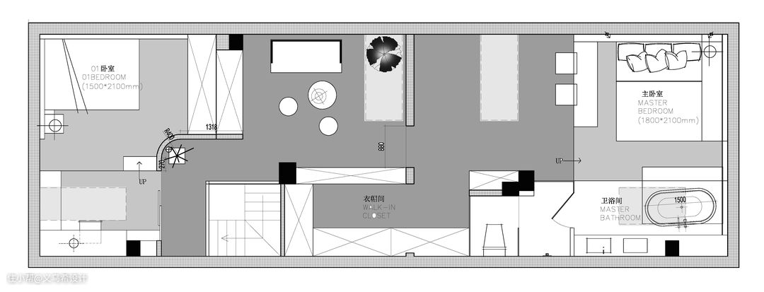 我们在格局上以采光天窗分为五个区域,起居室,卧室,主卧室(衣帽间,儿童玩乐区,卫生间)