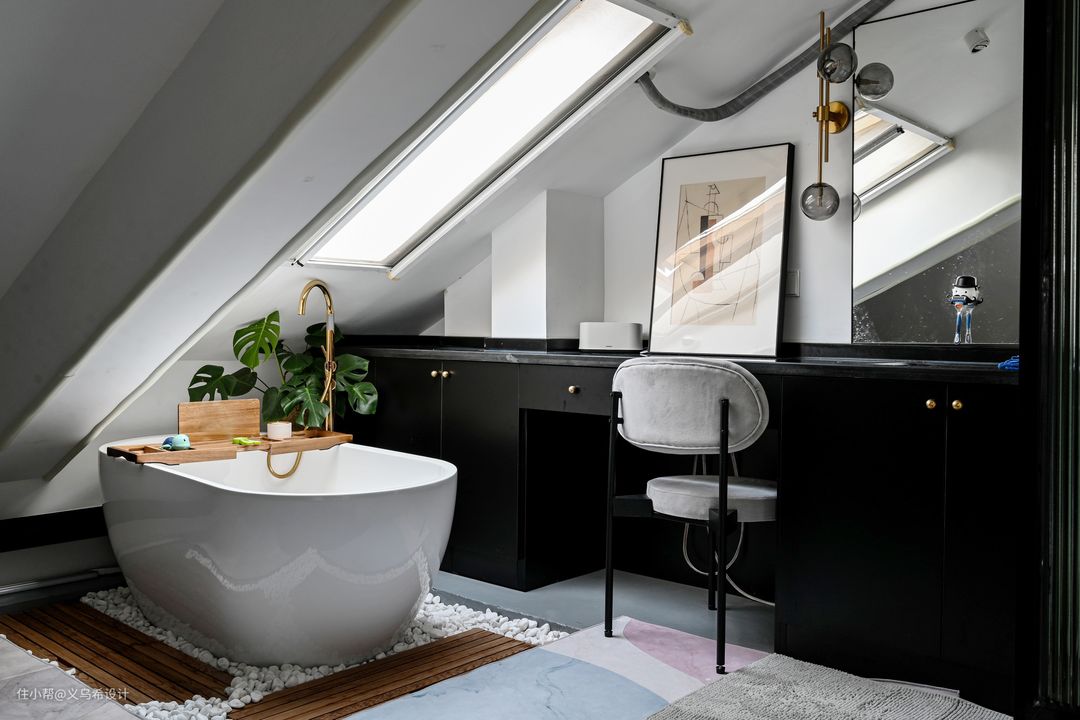 1.5米的成品浴缸倚靠着天窗,泡澡的时候,打开氛围小吊灯,放点音乐,抬头望着星空,小小的仪式感让人感到幸福。