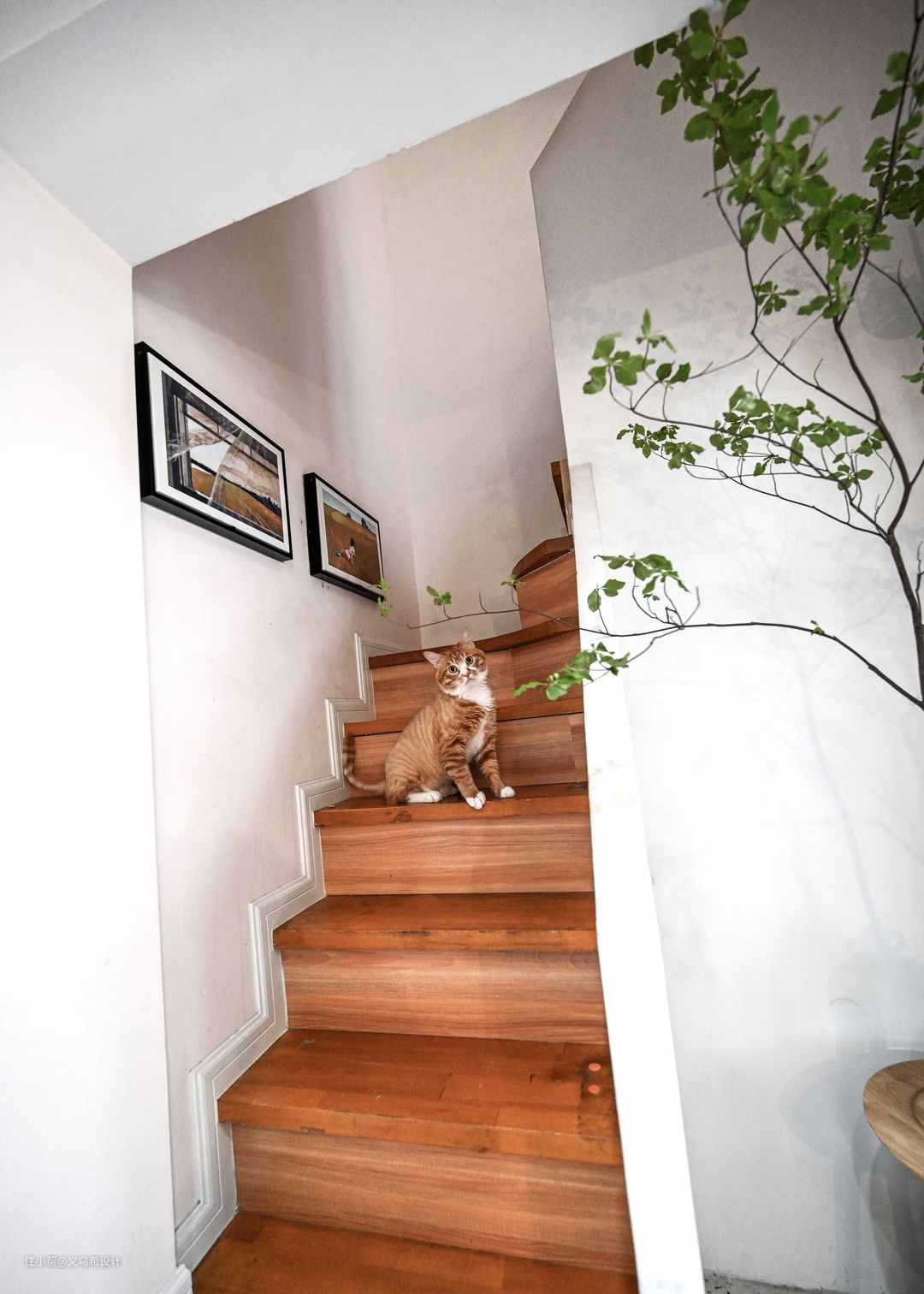 楼梯这个区域的意境是特地营造的,我们把原镂空的楼梯改造成了实体楼梯,踏步侧面木工板包掉面贴上木地板,整体感还不错。(请不要留意踏步上四个小孔,当时拆栏杆时留下的)