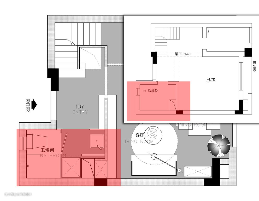 红色区域是门厅和楼梯区域的改造示意图。