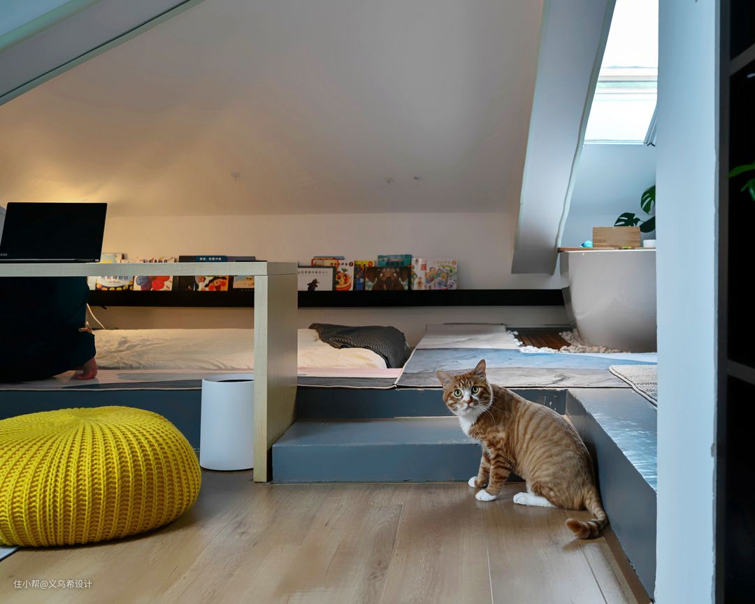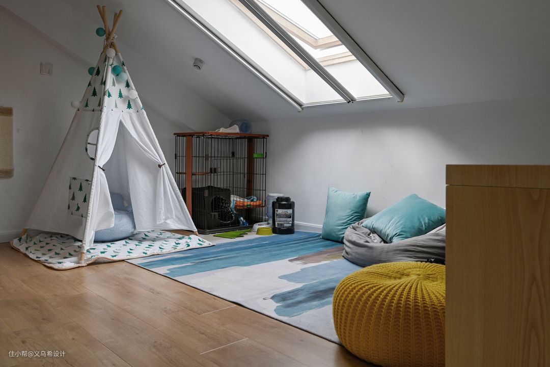 主卧一侧的玩乐区,是小朋友的最爱,靠墙放了一个小帐篷,在天窗下铺上一张地毯,两组懒人沙发,平时大人可以陪小朋友可以在这里玩耍,也可以休息。