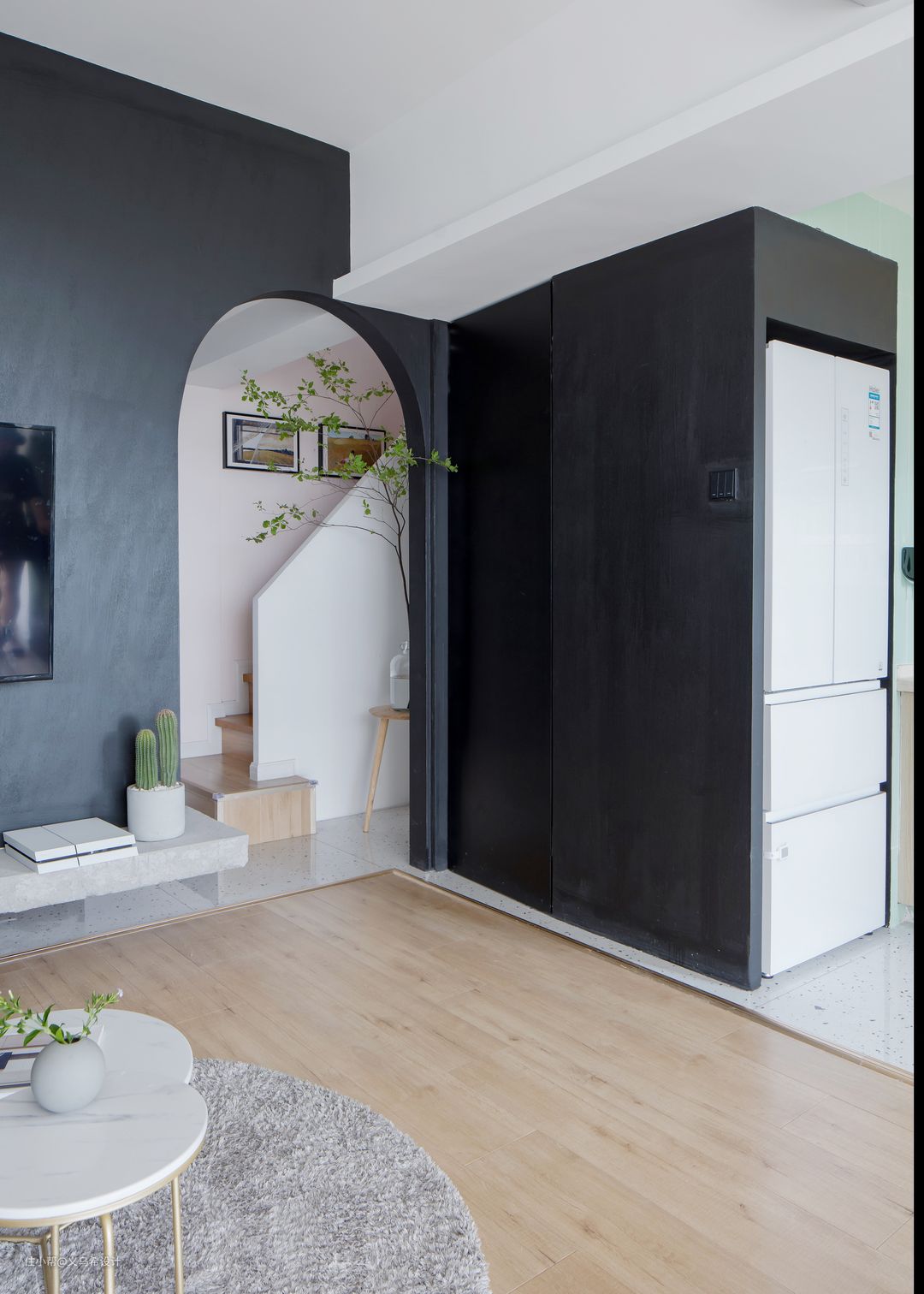 设计之初预留好冰箱的尺寸,砌墙时将冰箱刚好嵌入墙体。(看到厨房旁黑色的隐形门了吗,后面是秘密的储物间)