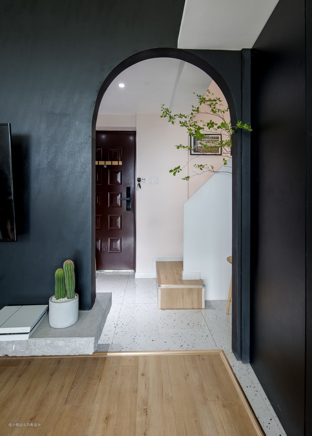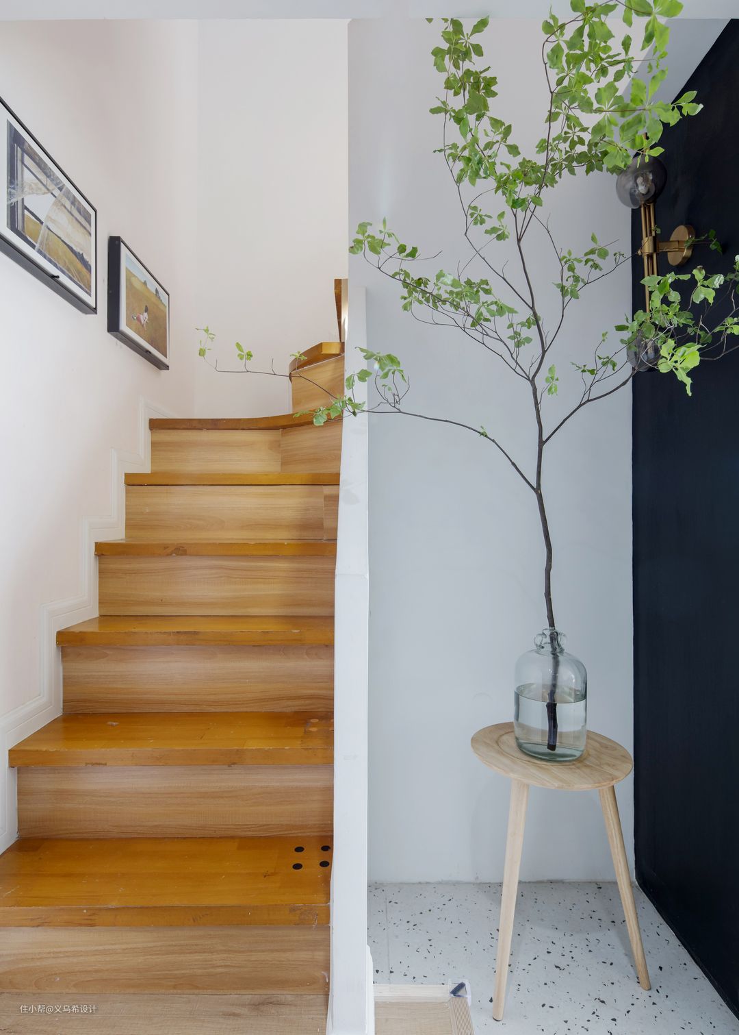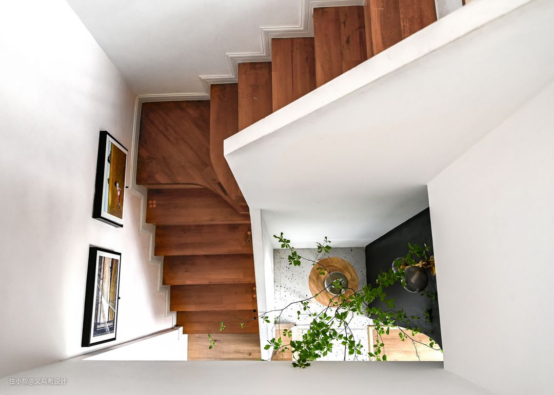 楼梯这个区域的意境是特地营造的,我们把原镂空的楼梯改造成了实体楼梯,踏步侧面木工板包掉面贴上木地板,整体感还不错。(请不要留意踏步上四个小孔,当时拆栏杆时留下的)