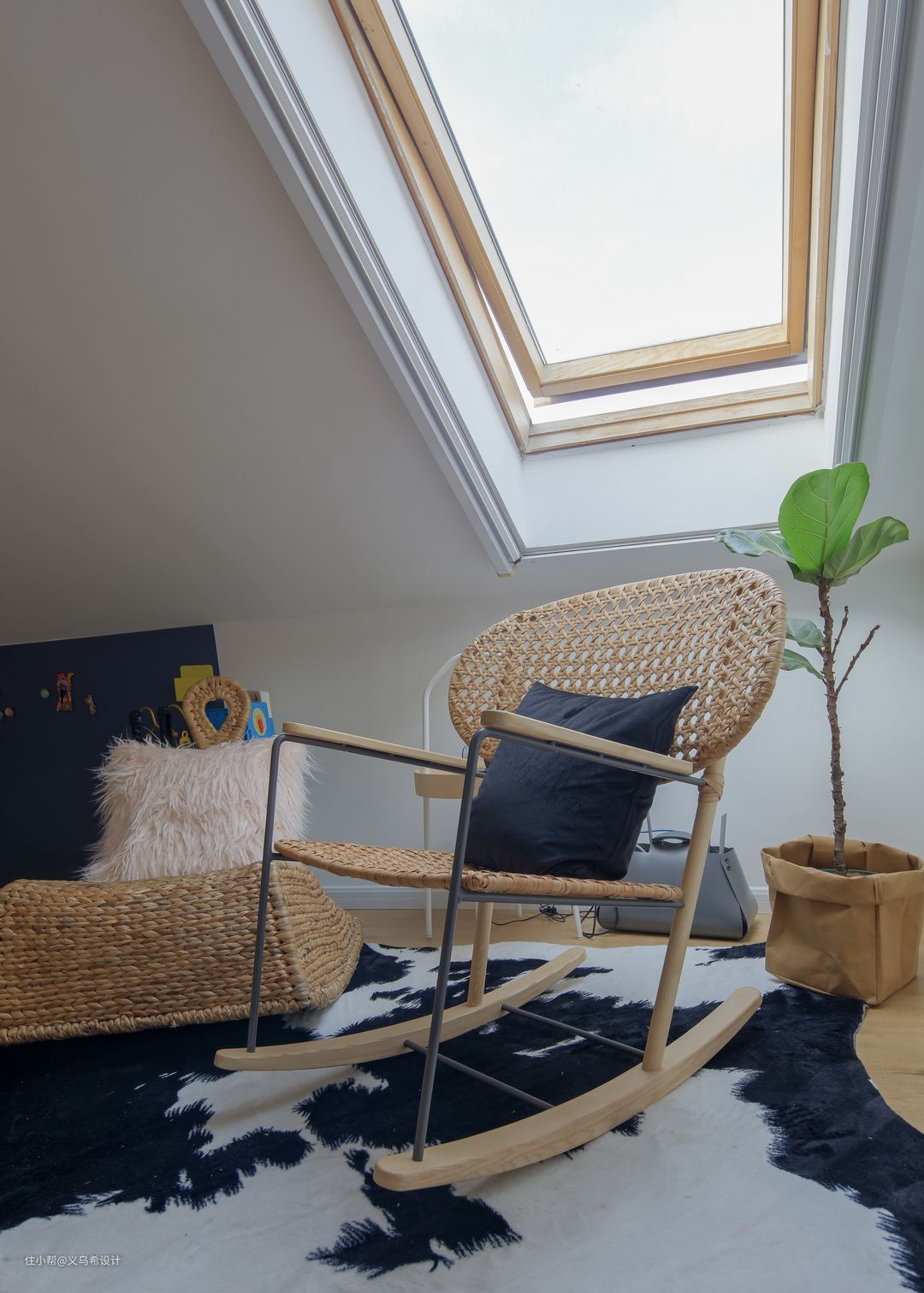 走上阁楼,迎面进入的是开放的起居室,天窗采光特别好,在这里放上一把躺椅,坐着看看书,抬头看看外面的天空,思考思考人生,非常惬意。