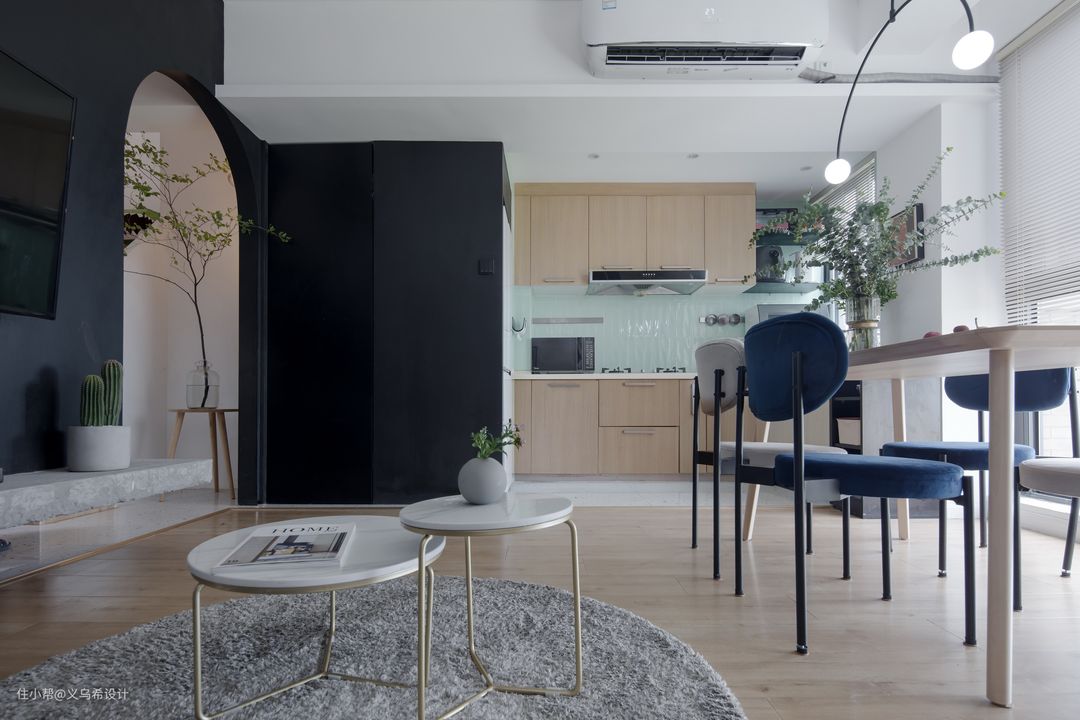 厨房的橱柜保持原状不变,在顶部墙面地面上了三块改造: 1,厨房开放后,原顶部集成吊顶拆掉做上石膏板吊顶,和客厅的顶部连成一体更协调。 2,原来的墙地面砖因为使用年份久特别脏,墙面换成了水蓝色的小条砖,地面白色的水磨石,厨房瞬间整个感觉就不一样了。 3,厨房墙体拆掉后,橱柜连接墙体的背板露出来了,重新订门板颜色也有色差,就买了个黑色的装饰柜收口,台面装饰上一束花,又是美好的一天。