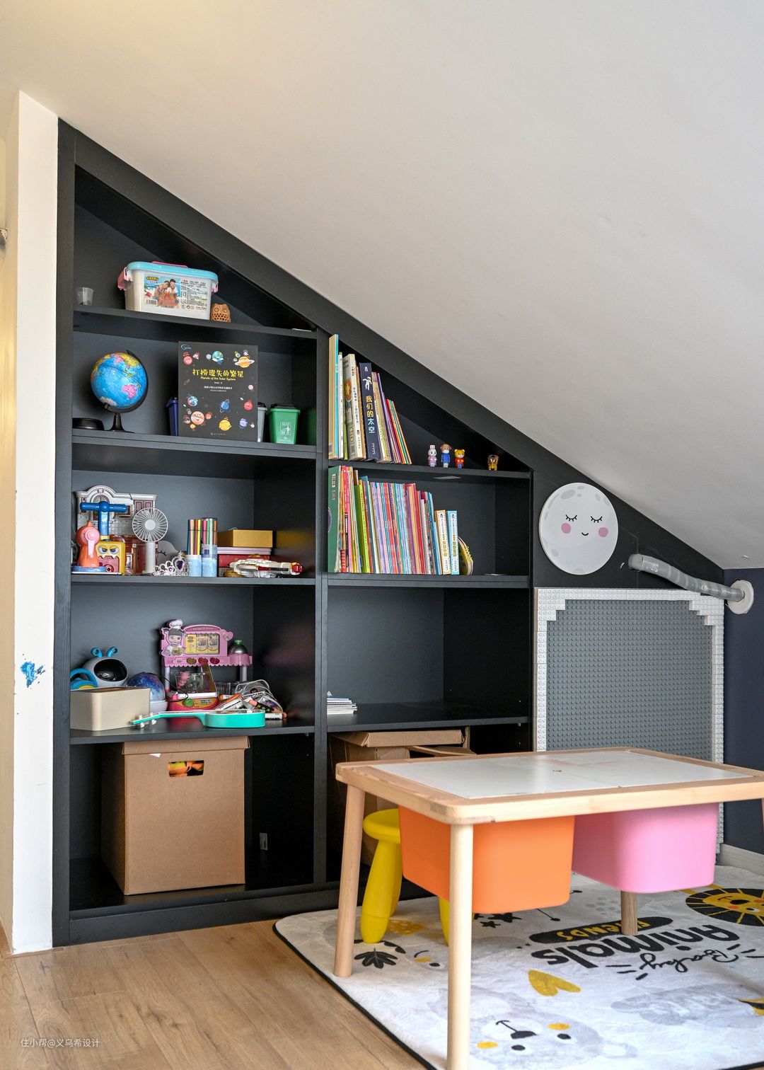 起居室靠近斜坡位置做上了一排书柜,书架摆上小朋友喜欢的书和玩具,小朋友喜欢涂鸦,给他准备了一个小黑板,这里是小朋友独有的小天地。