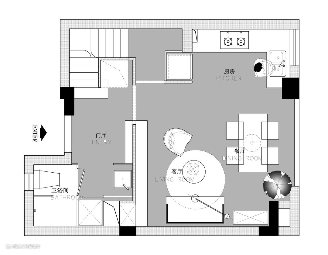 一层平面布置图 户型优化: 1,打通客餐厅厨房这一片区域,让空间开阔起来,自然光线也能够照射到每个角落。 2,改造卫生间,增加门厅功能区。 3,重塑楼梯区域,好看同时还实用。 4,由于预算不高所以定的装修主基调,除了必要的格局拆改外,基础装修能不动的尽量保留,把每一分预算花在家具家电,体验感强的地方。