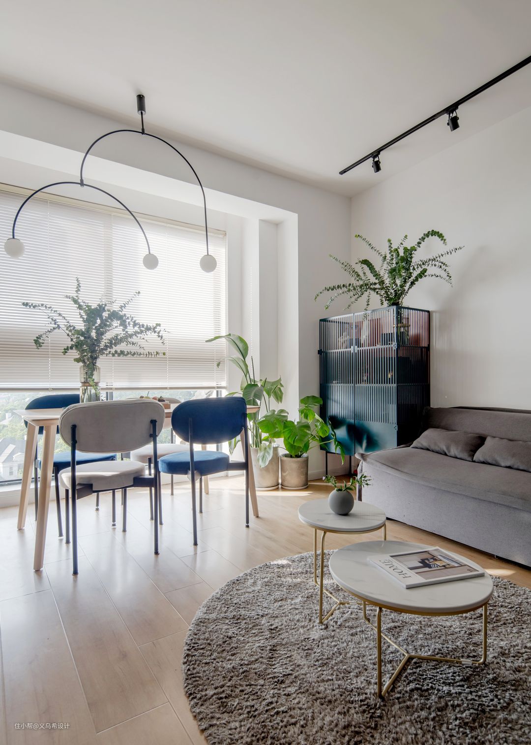 顶上设计的无主灯设计,客厅的照明主要通过射灯,餐厅是吊灯,局部的点照明让家里更有氛围。