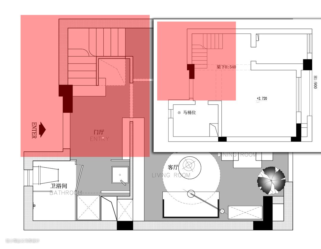 红色区域是门厅和楼梯区域的改造示意图。