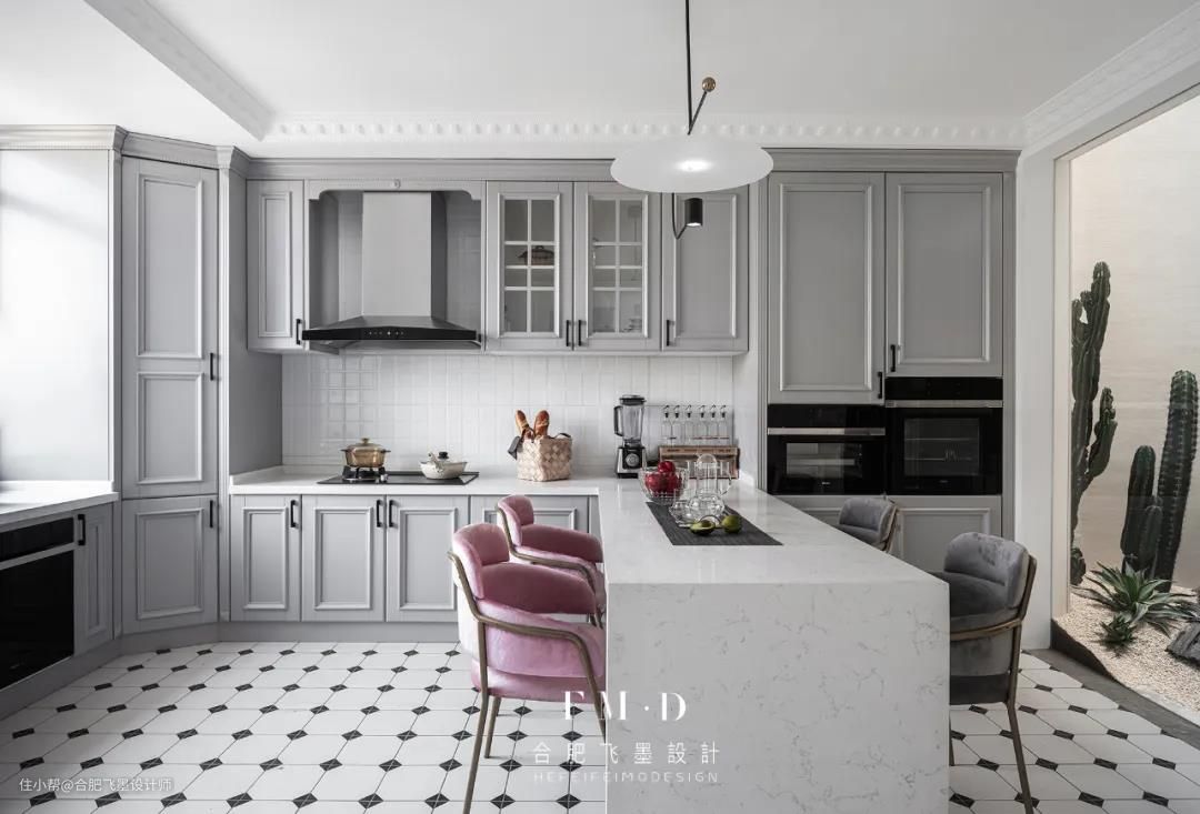 业主的父母在附近有一栋房子,所以业主不常在家做饭,餐厨的空间便不用考虑油烟的困扰,将小阳台扩入厨房,扩大厨房的使用面积,并将餐厅与厨房连接在了一起,做了一个敞开式的社交性餐厨空间