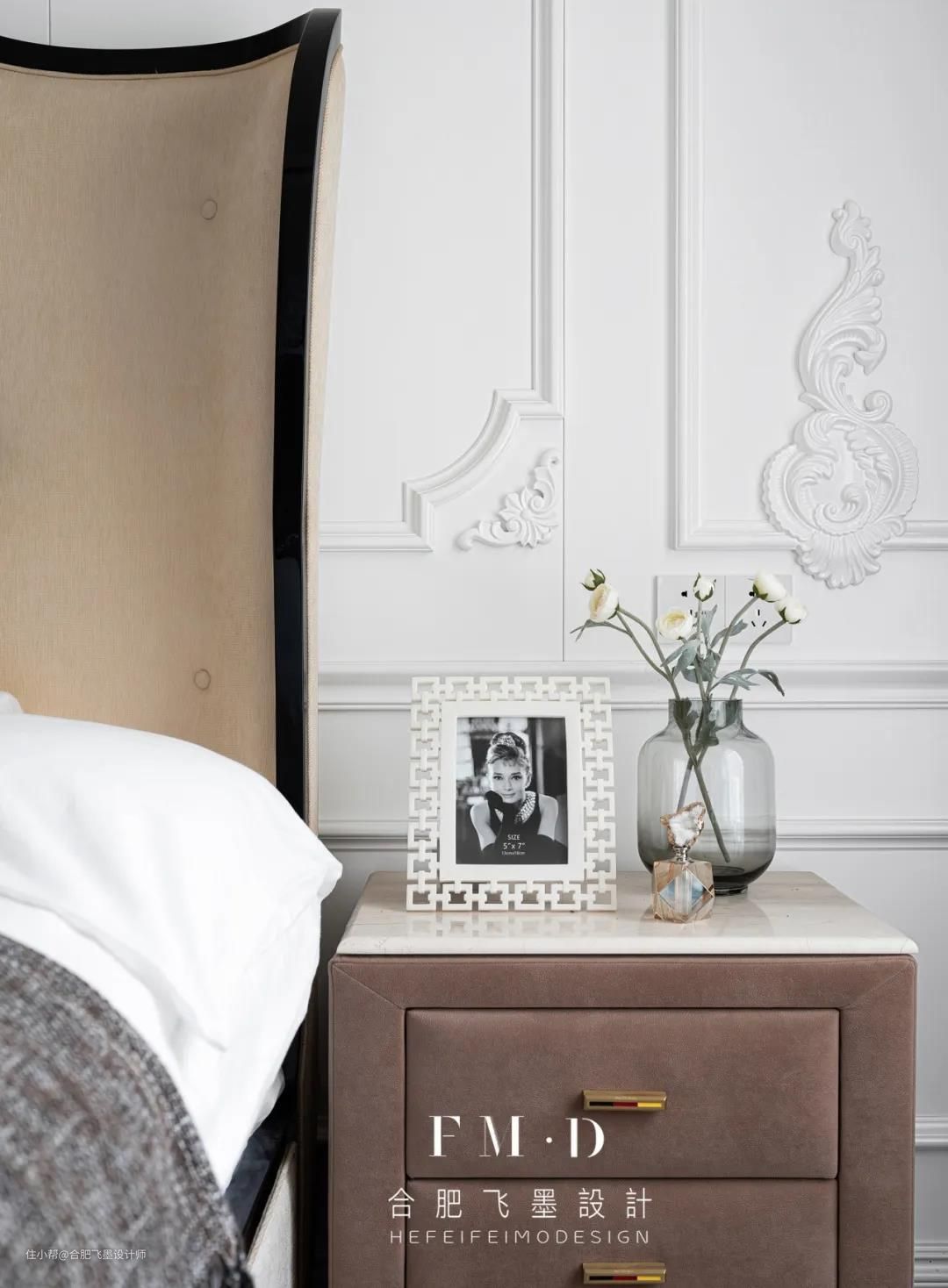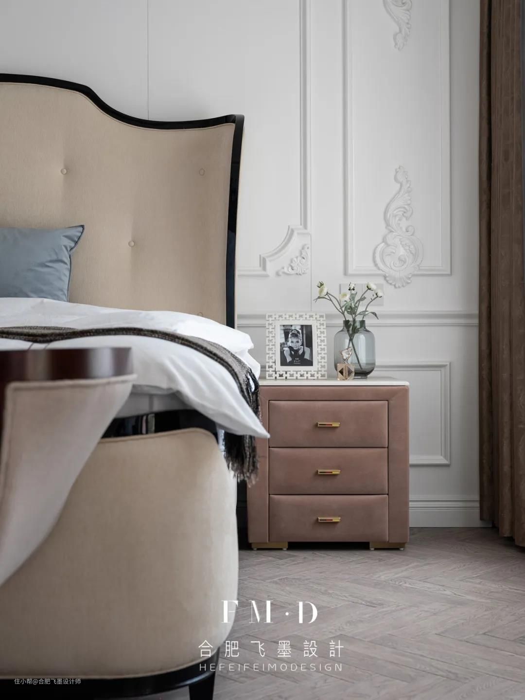 原始梁体下掉过多,为了保证层高,我们做了一个圆弧造型的处理,完善空间的艺术性,有时候,正是因为不完美,才能成就别具一格的设计。 配色柔和宜人,细节精美雅致,家具大气舒适,予生活以舒适感。 主卧床头吊灯: