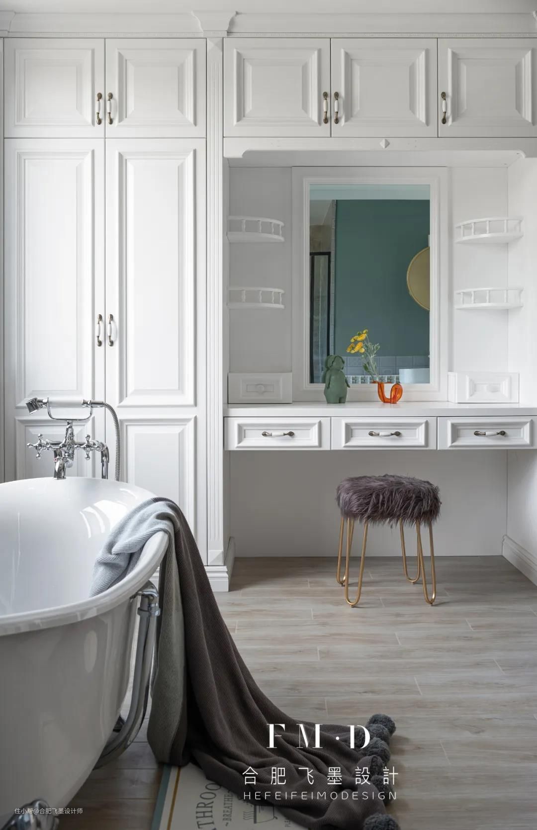 三楼一整层都作为屋主的使用区域,舒适的卧室配备了一个四分离卫生间,让三楼的舒适度达到最佳的状态。 女业主一直希望拥有一个大大的卫生间和衣帽间,我们把她的这个梦想在卫生间里都得以实现,卫生间内同时配备了衣帽柜以及梳妆台,满足多样化的生活场景。