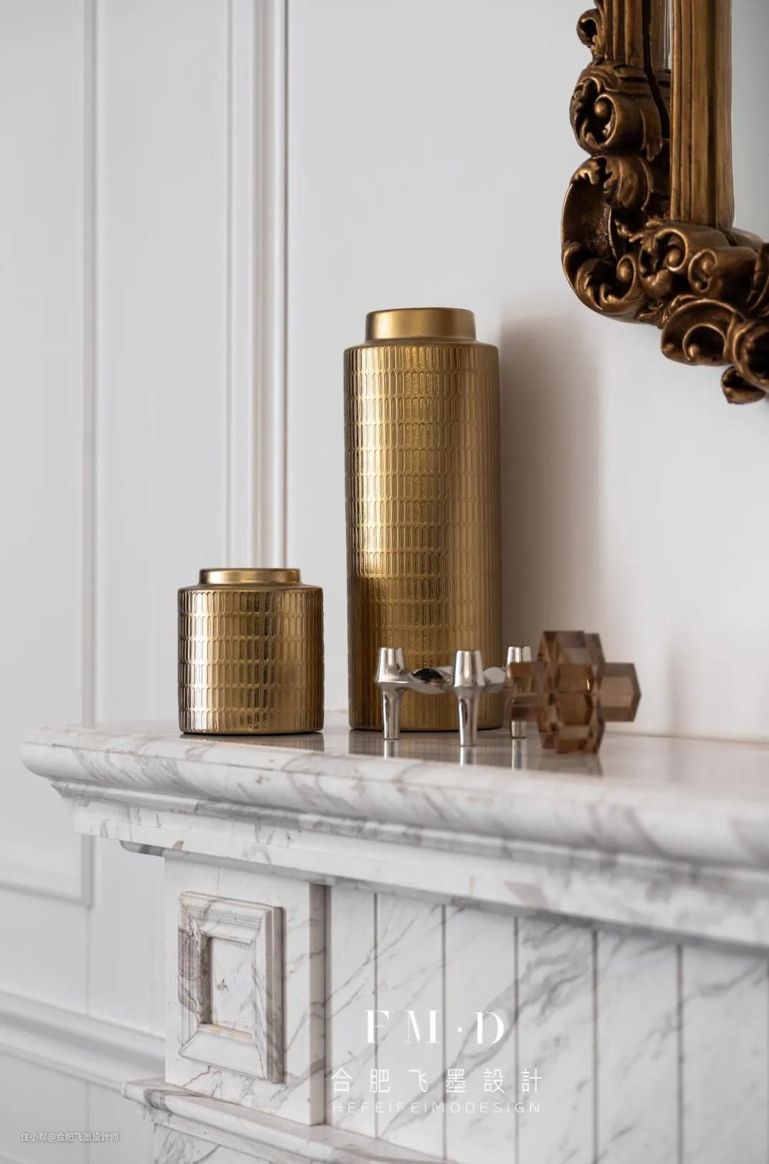 电视不再是客厅主角,置于一隅给生活腾出更多的空间,大理石壁炉造型与黄铜镜搭配,复古浪漫;侧望天井,阳台和植物丰满视觉享受;墙面精美的石膏线条、复古黄铜摆件...无一处不精致,无一处不美好。