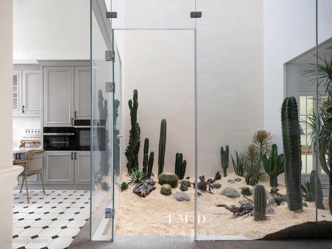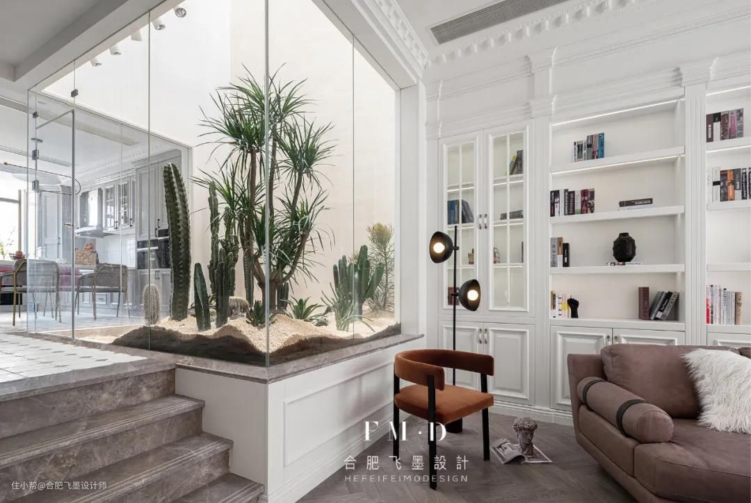 业主一直觉得天井是最鸡肋的一个存在,同小区的很多人都把它现浇成了房间;显然,这并不是从事艺术类工作的女业主想要的。千篇一律的设计既无法满足艺术造诣,也会影响空间采光。 对于房子,她更加注重光线的穿透、线条感的营造。所以,在设计师的建议下,将天井的顶部用透明材质封顶,保留原始的挑高,用玻璃做了一个围合型的室内景观,使大自然的格调融入室内,阳光填充空白,家,这个生活的容器,正因为不同,才更显个性。