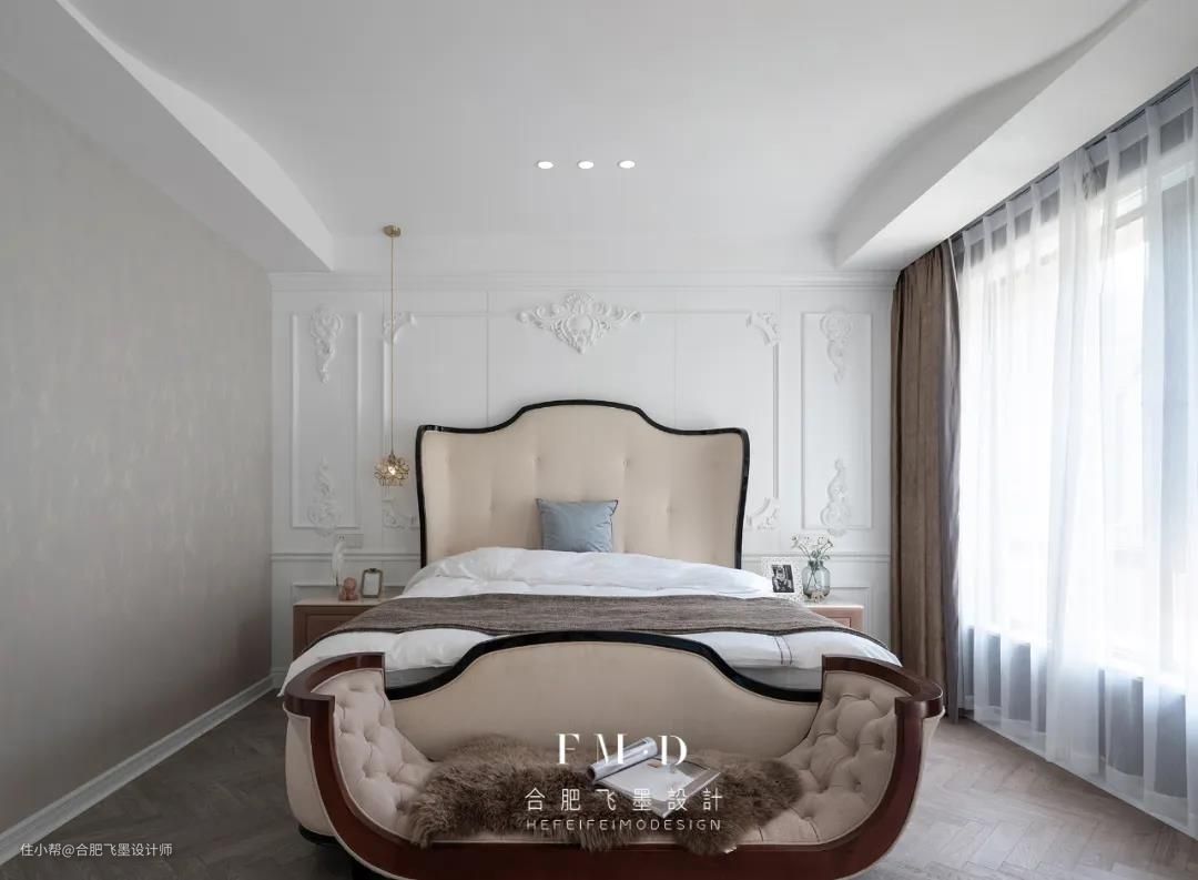 原始梁体下掉过多,为了保证层高,我们做了一个圆弧造型的处理,完善空间的艺术性,有时候,正是因为不完美,才能成就别具一格的设计。 配色柔和宜人,细节精美雅致,家具大气舒适,予生活以舒适感。 主卧床头吊灯: