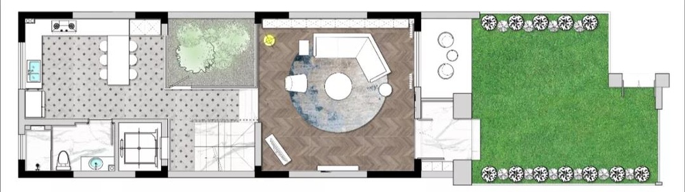 一楼主要规划了院落、客厅、餐厨与一个“鸡肋”天井。