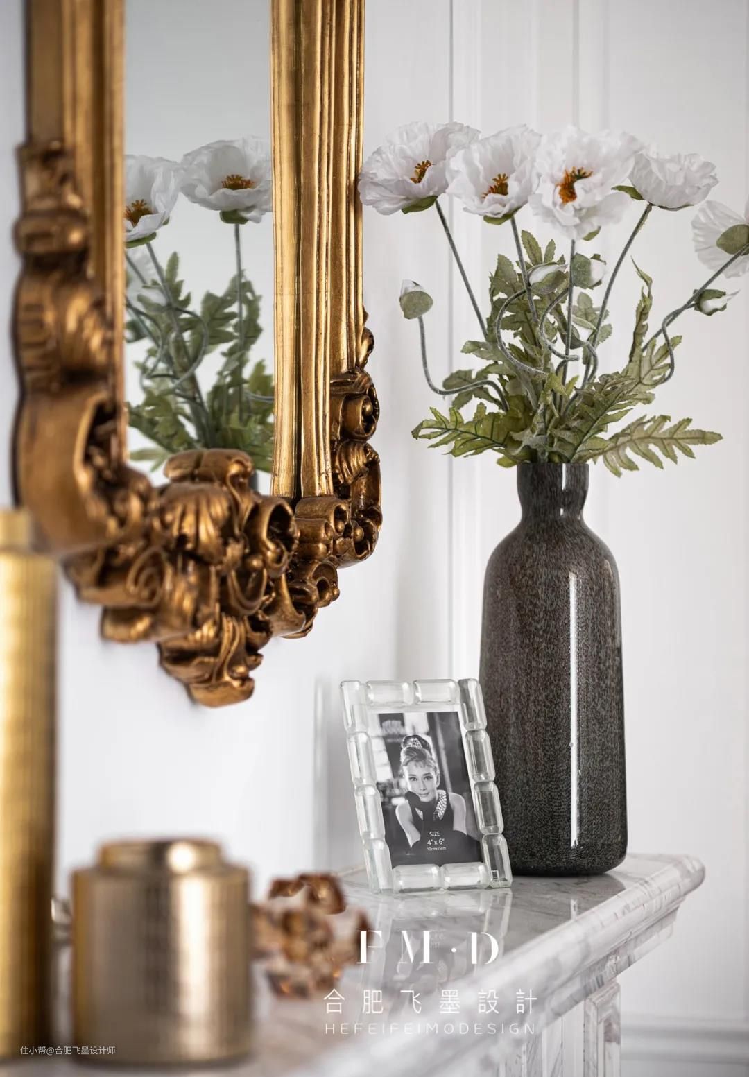 电视不再是客厅主角,置于一隅给生活腾出更多的空间,大理石壁炉造型与黄铜镜搭配,复古浪漫;侧望天井,阳台和植物丰满视觉享受;墙面精美的石膏线条、复古黄铜摆件...无一处不精致,无一处不美好。