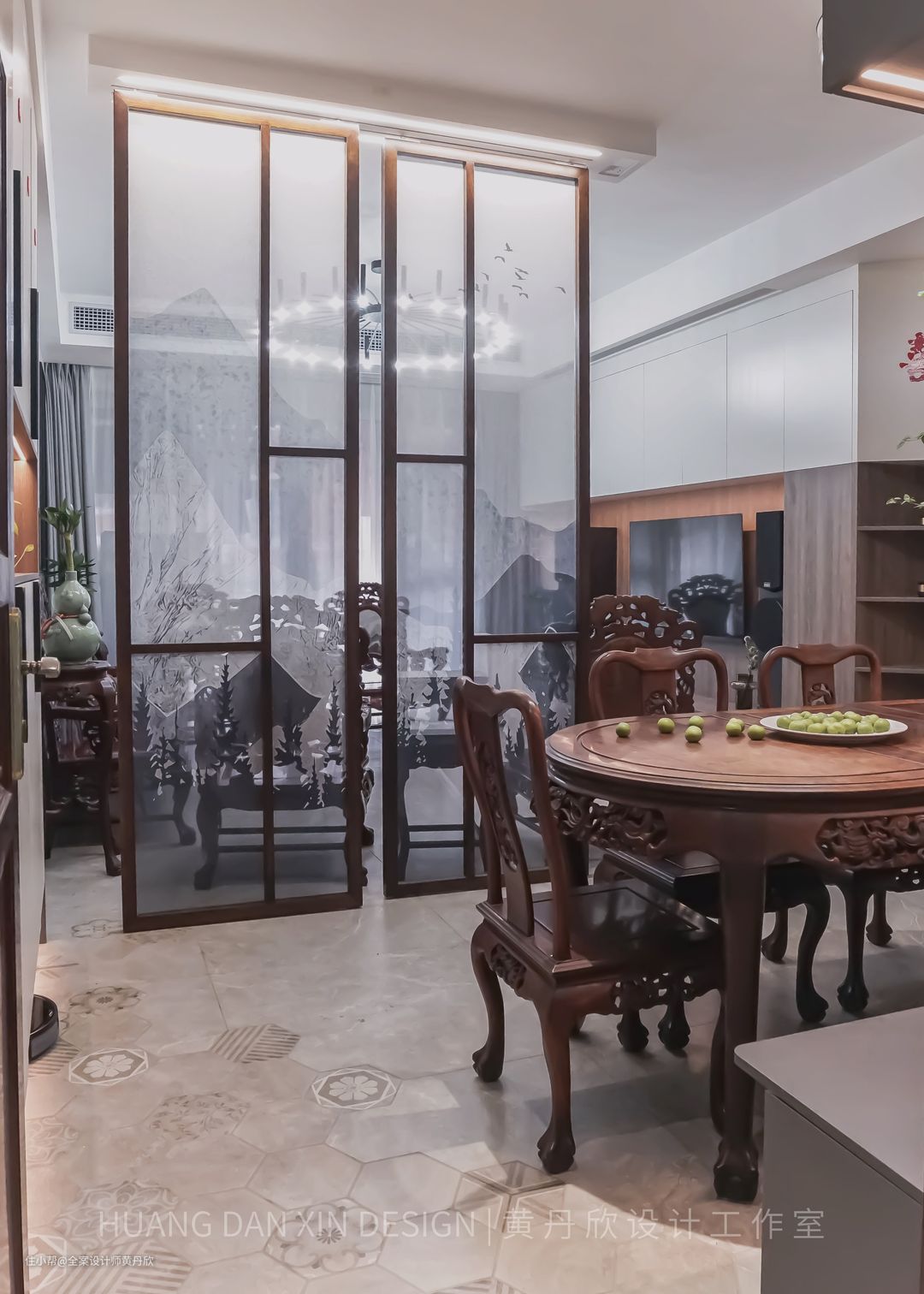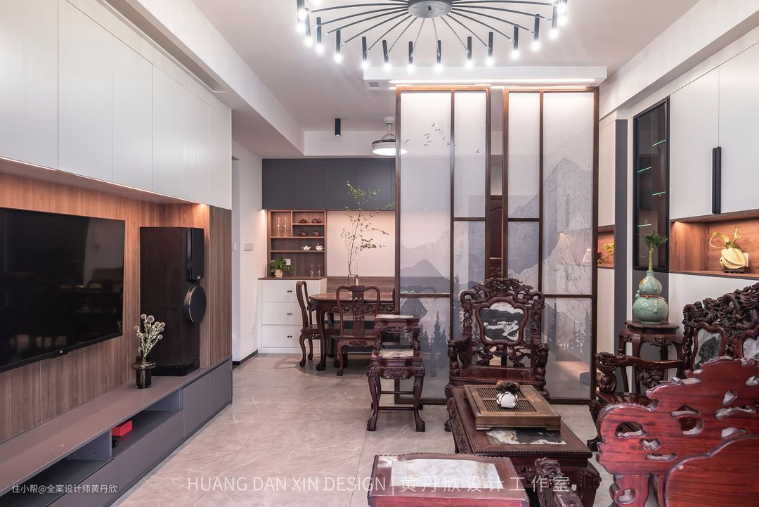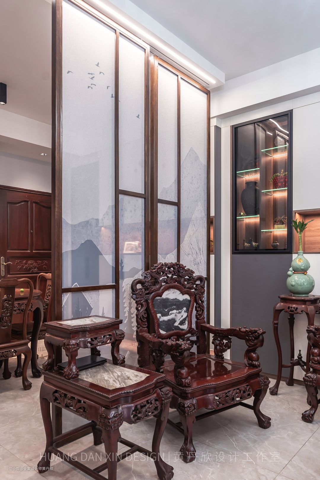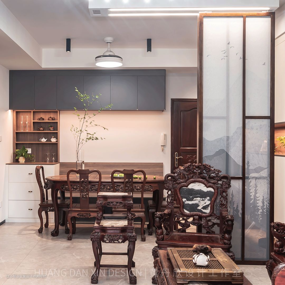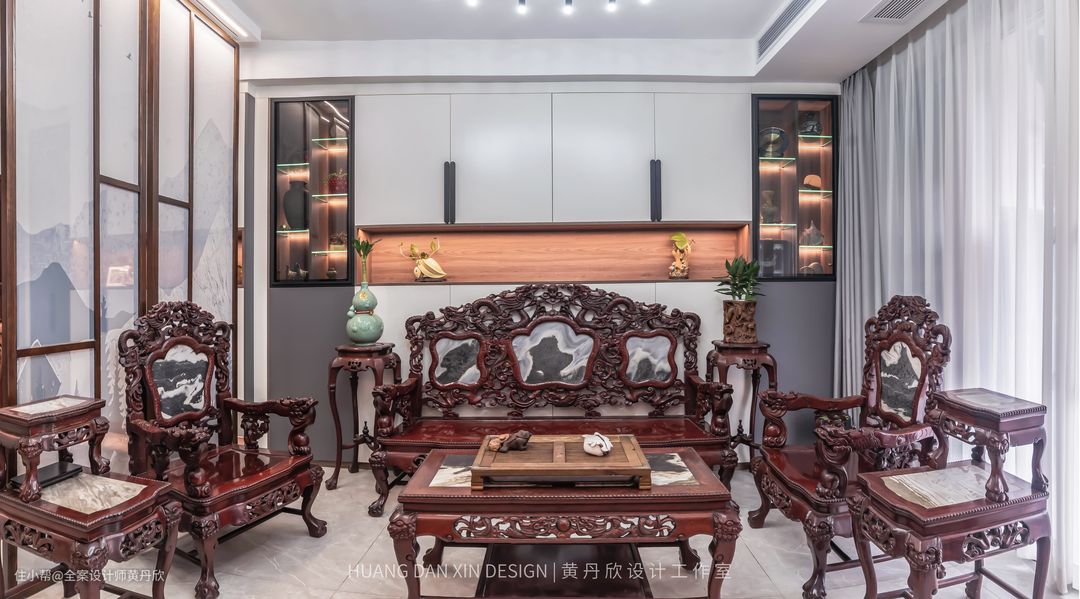 屏风的木色特意选择的跟红木家私接近的颜色,有所呼应,整体效果更为和谐。