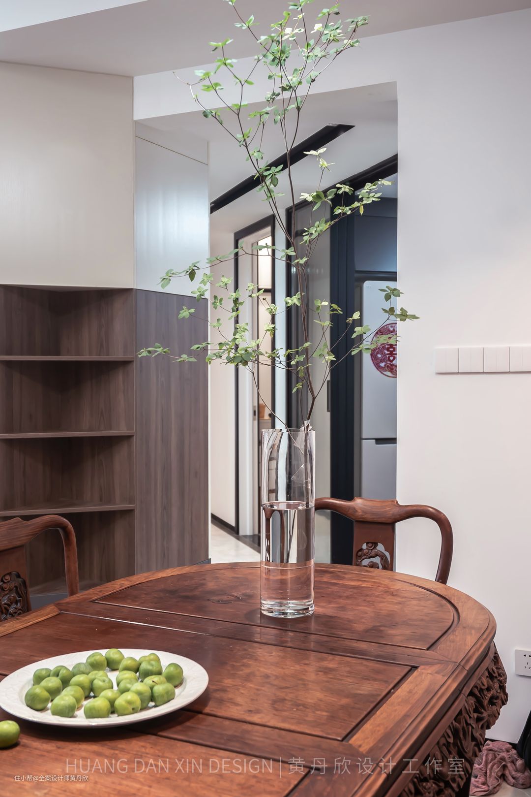 走廊处望向入户门角度。“吊钟”的树叶犹如花瓣,形态非常优美舒展,不动声色地提升了空间的气质。