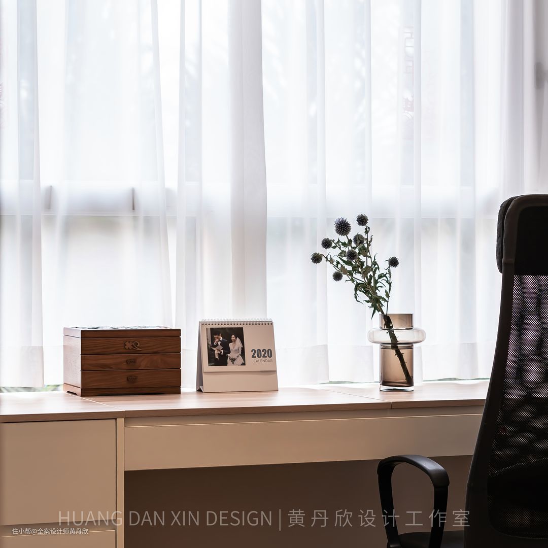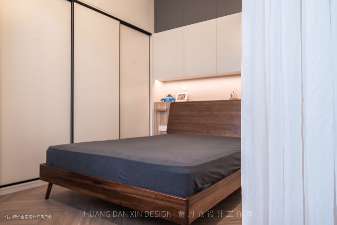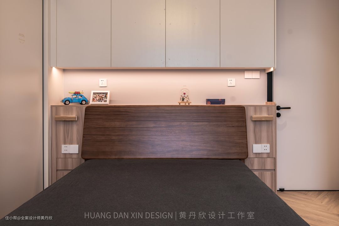 因为走道较窄,放床头柜会很拥挤,所以在床屏两侧做了小抽板,晚上可以放手机充电还有眼镜等杂物,小抽板下方还做了一个抽屉,相当于把床头柜和床屏柜整体化了。 结束语:房子是有生命力的,在屋主精心的呵护下,一定会越来越好。装修完新家,只是创造未来美好生活的第一步。相信在业主一家的慢慢经营中,软装会逐渐地变得丰富,“家”会变得越来越美,越来越有“他们的味道”。