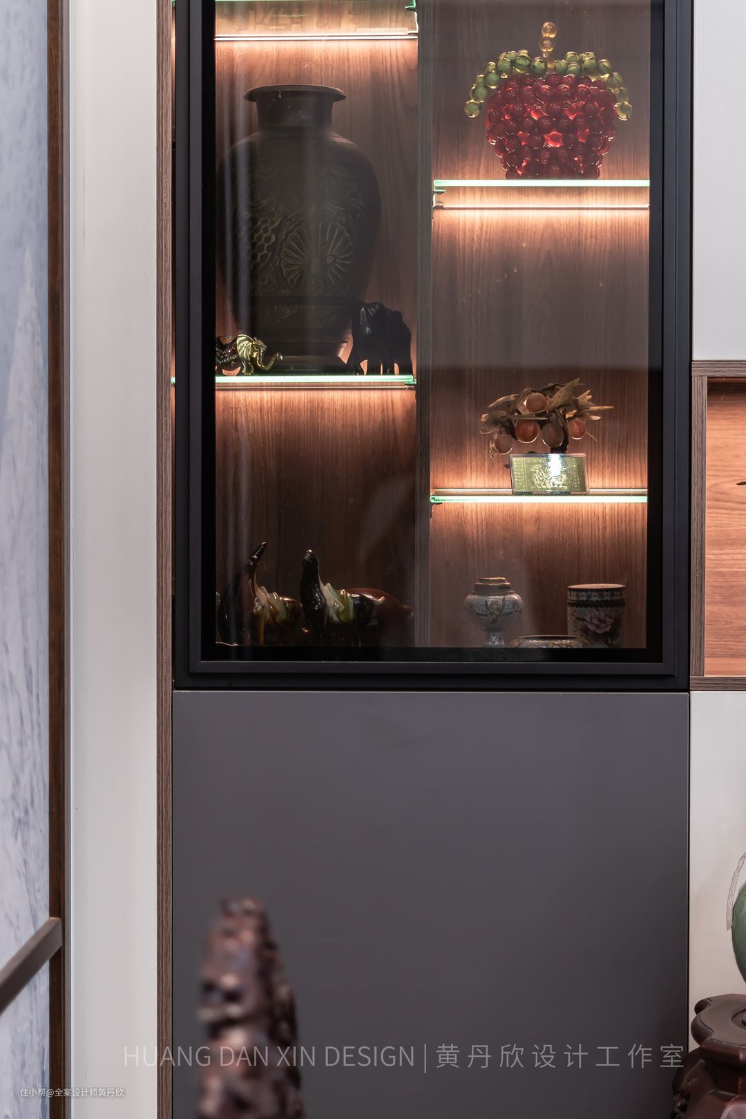 客厅两侧的展示柜,很好地收纳进业主爸妈的收藏品。柜门采用灰玻,统一了藏品的颜色,不会显得杂乱,内部玻璃隔板的后部藏灯带,打亮了收藏品的细节,更显高档。