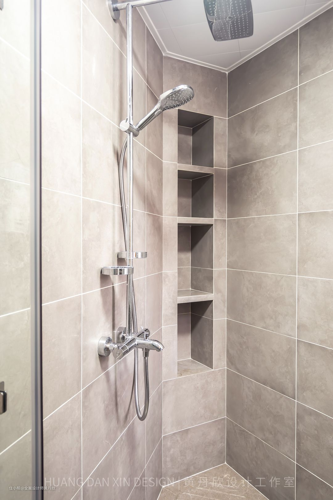 灰色的墙砖,方便后期搞卫生,砖缝做了环氧彩砂填缝,不会发霉发黑。壁龛的位置原来为一个尖角,特意做平,并砌筑了壁龛,对空间充分利用。