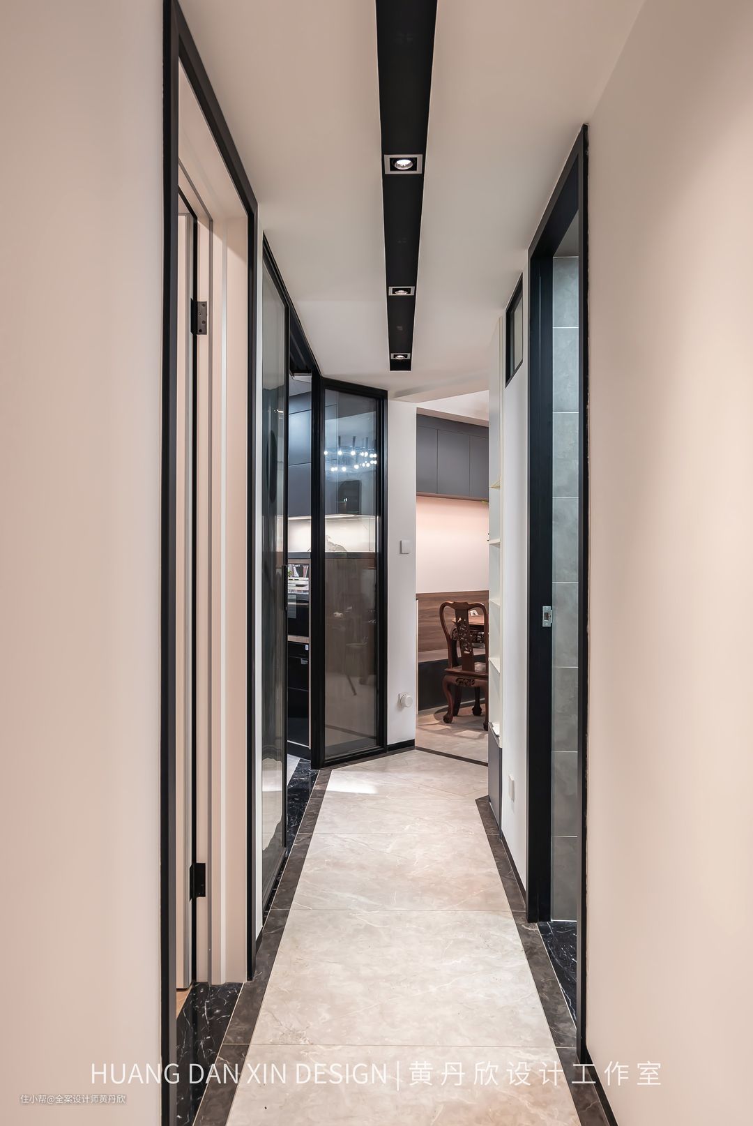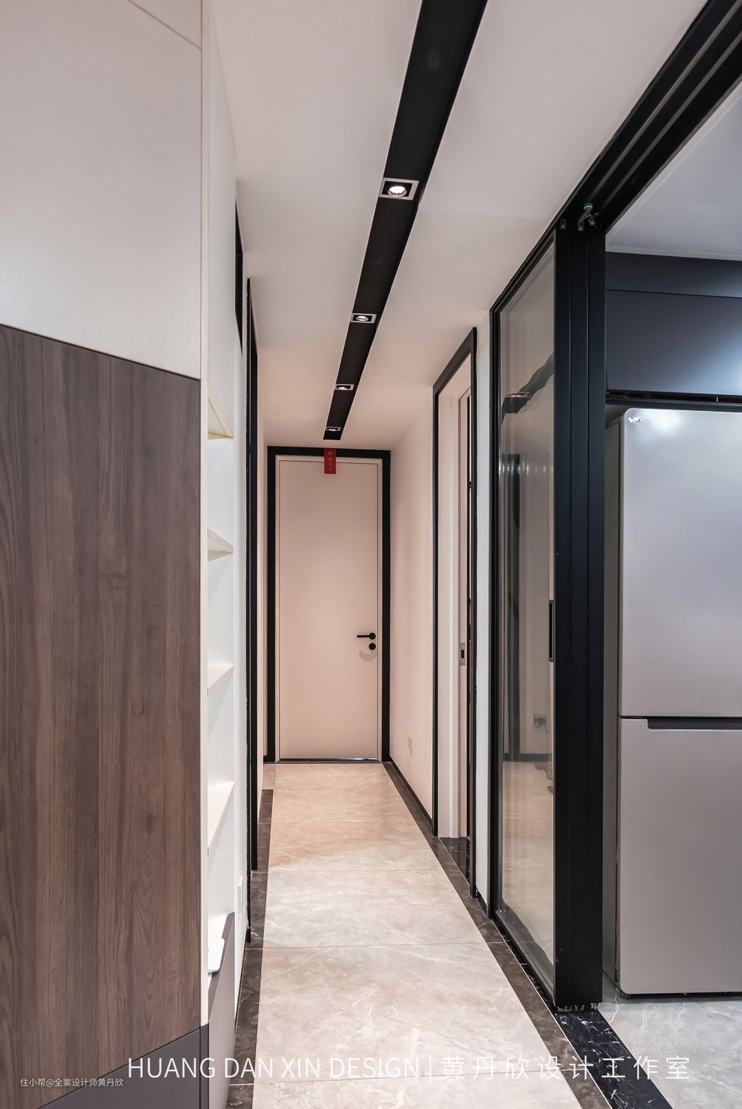 改造之后,走廊顶部做了吊顶,隐藏很乱的梁体,并且高度跟厨房控制成同等高度2400mm,延伸了视线,也不显得压抑,走廊看起来比之前要宽敞很多。走廊采用“勾边”的设计手法,所有的门洞高度都做到顶,并且门套线选择了黑色,地面走黑色波打线,踢脚线采用4cm的黑色瓷砖踢脚线,吊顶做了黑色的凹槽装防眩光射灯,指引性的线条的勾勒,使得走廊空间显得非常挺拔干净。