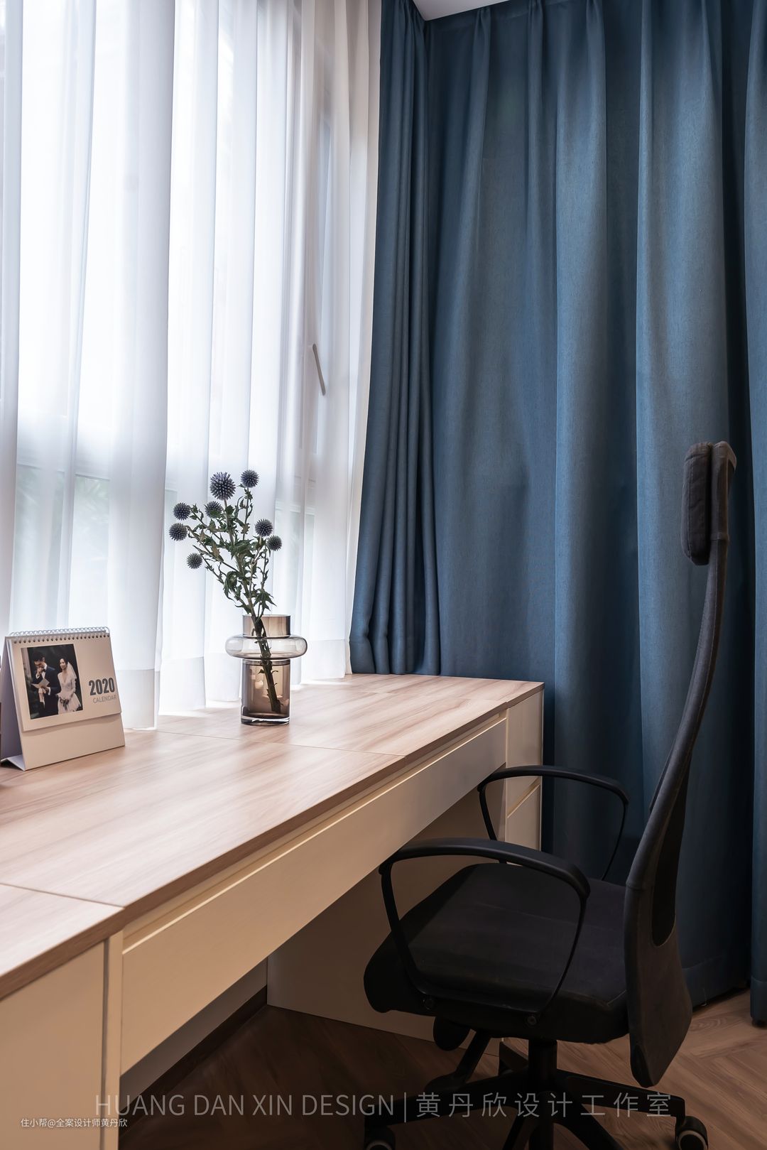 蓝色窗帘后面就是原本的排污管位置,现在这个位置成为房间的一个大件杂物收纳区,冬天的大衣不经常换洗,也可以收纳在里面。抽屉的厚度经过计算,可以舒舒服服地翘脚或者盘腿。