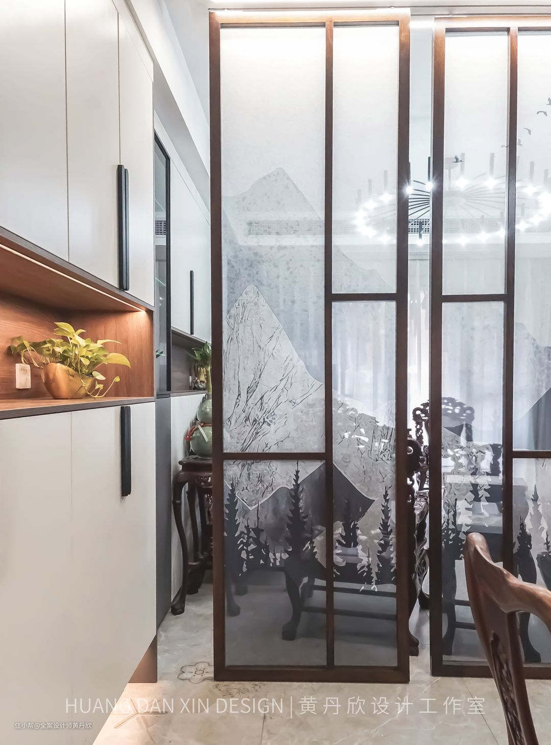 改造后,左手边的超大容量鞋柜,可以很妥帖地收纳鞋子,衣服,包包等物品,保持空间的整洁。两扇屏风隔而不断,保持视野的通透。鞋柜的细长拉手和玄关的分割线条起到呼应的作用,从视觉上拉高了层高。