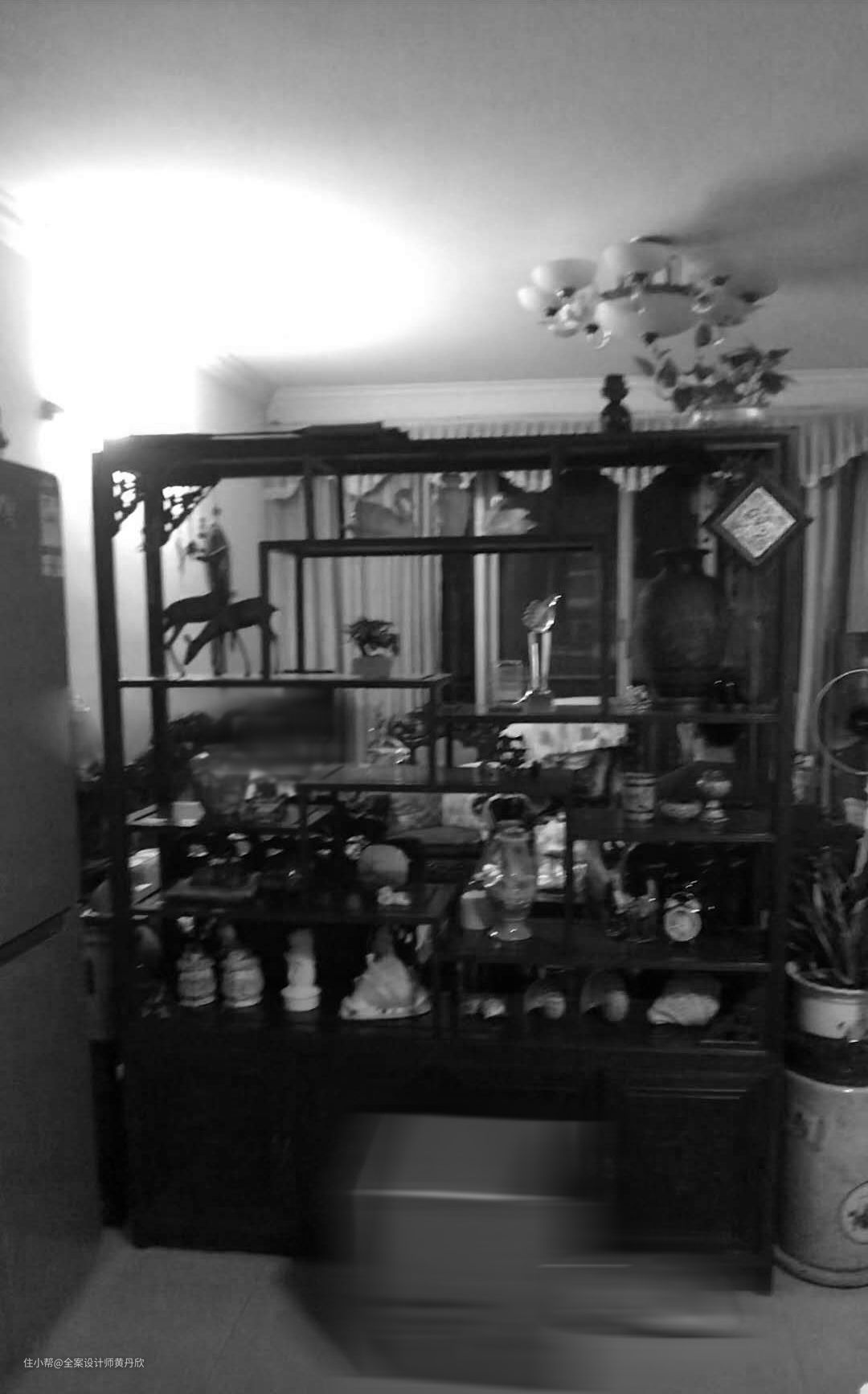 改造前,业主家采用了博古架进行隔断,但是因为藏品颜色太杂,且博古架体积很大,入户感觉会有些压抑。