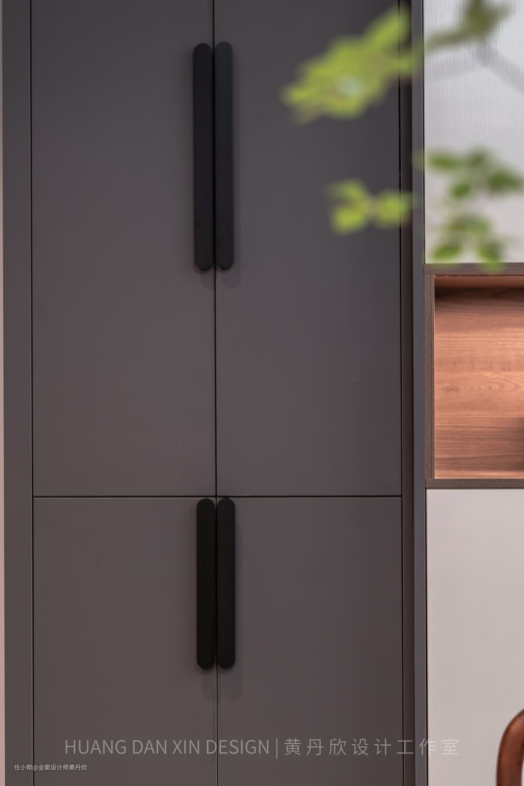入户门为内开,因为门后位置不够,相邻的两个柜子厚度不同,通过第一个柜子和第二个柜子的侧板都选择了深灰色,使得视觉一体化,就会忽略了两者的厚度不同。