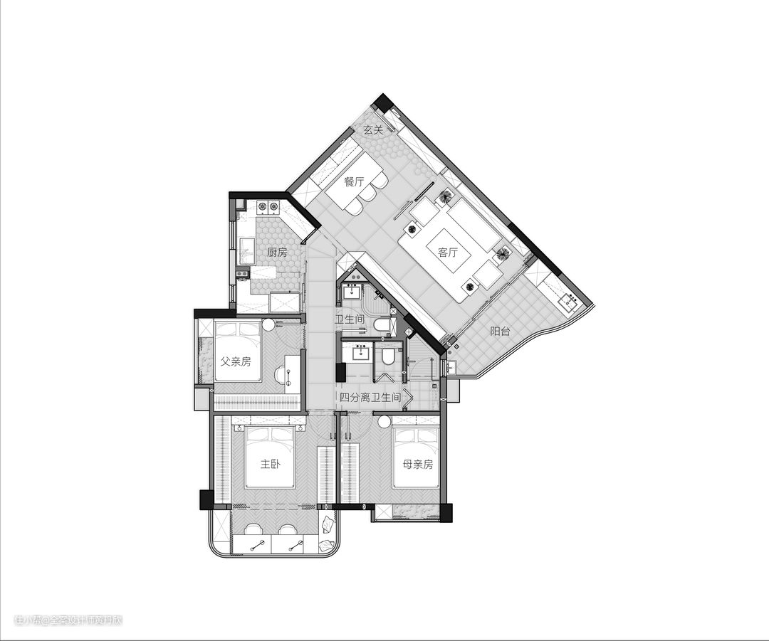 平面布置图,主要空间调整如下: 1.将公用卫生间合并到厨房区域,并打掉厨房的非承重墙,将走道入口扩大,厨房门口采用玻璃吊轨门,增加了走廊的采光还有提高了空间的通透感,并且通过定制柜化解了走廊入口的尖角; 2.将母亲房原与配套卫生间的共墙向内移动,得到四分离卫生间的走道空间,并且利用墙排马桶,使得地面不用抬高。 3.入户采用可推拉屏风,解决了隐私和通风问题; 4.主卧通过并入阳台,创造了宽敞的工作和休闲区。