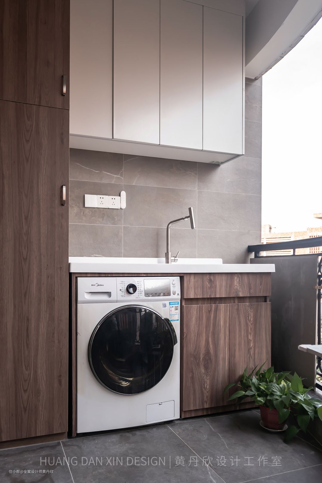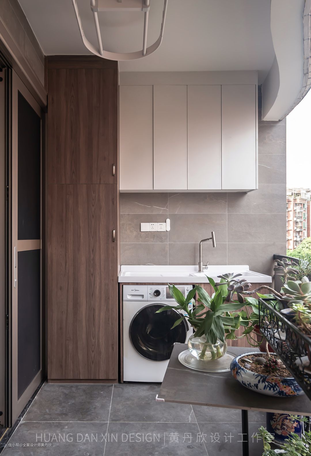 阳台也设计了充足的收纳空间,左边的高柜能够收纳进清洁用品和一些工具,甚至烘衣架。右边的洗衣柜,能够方便地手洗衣物还有取水。吊柜部分可以收纳一些使用频次较低的物品。
