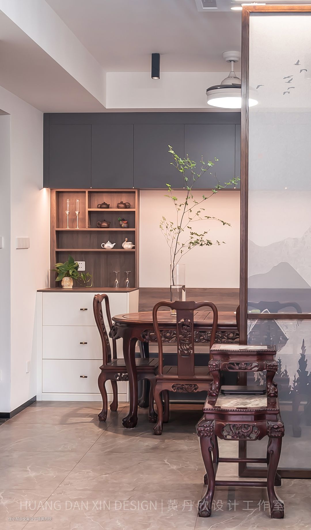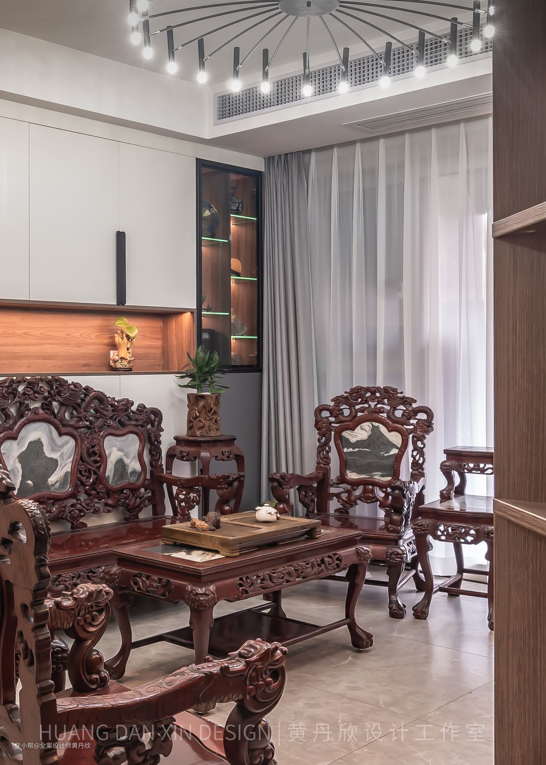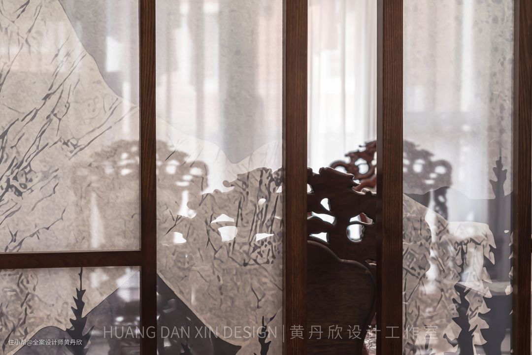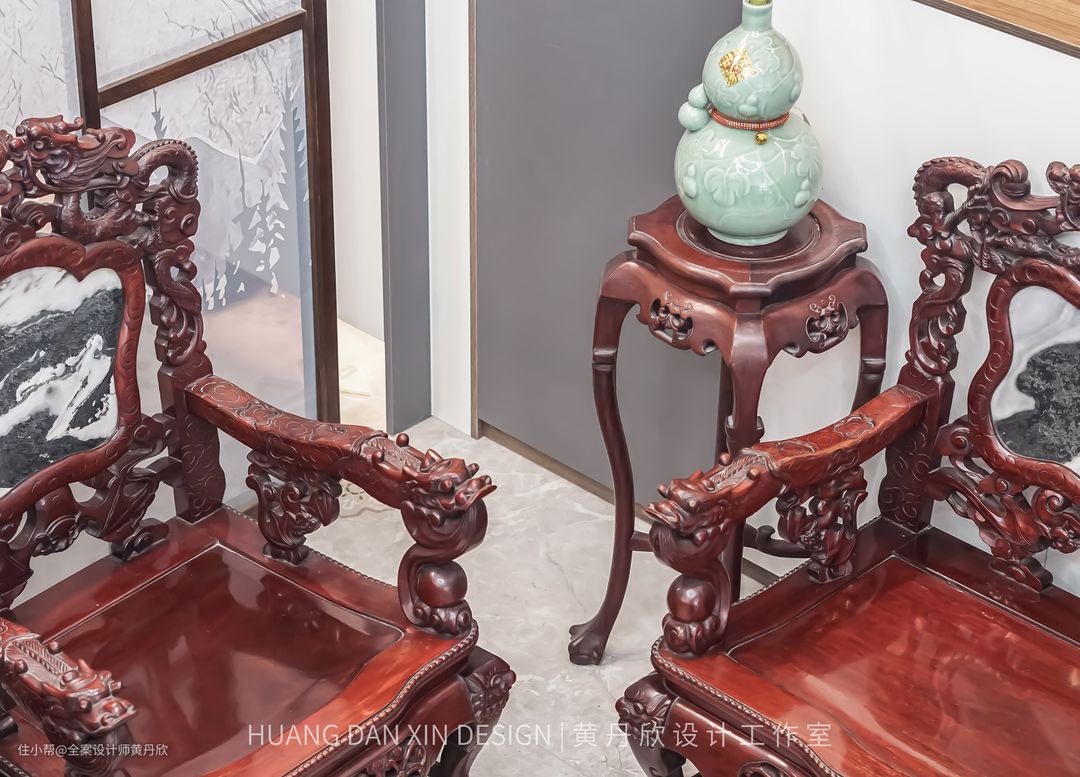 屏风的木色特意选择的跟红木家私接近的颜色,有所呼应,整体效果更为和谐。