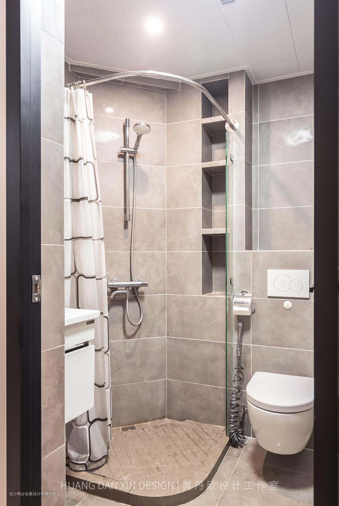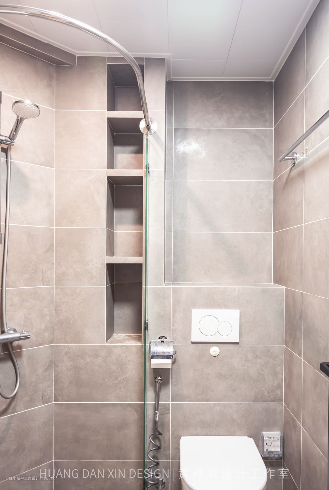 灰色的墙砖,方便后期搞卫生,砖缝做了环氧彩砂填缝,不会发霉发黑。壁龛的位置原来为一个尖角,特意做平,并砌筑了壁龛,对空间充分利用。
