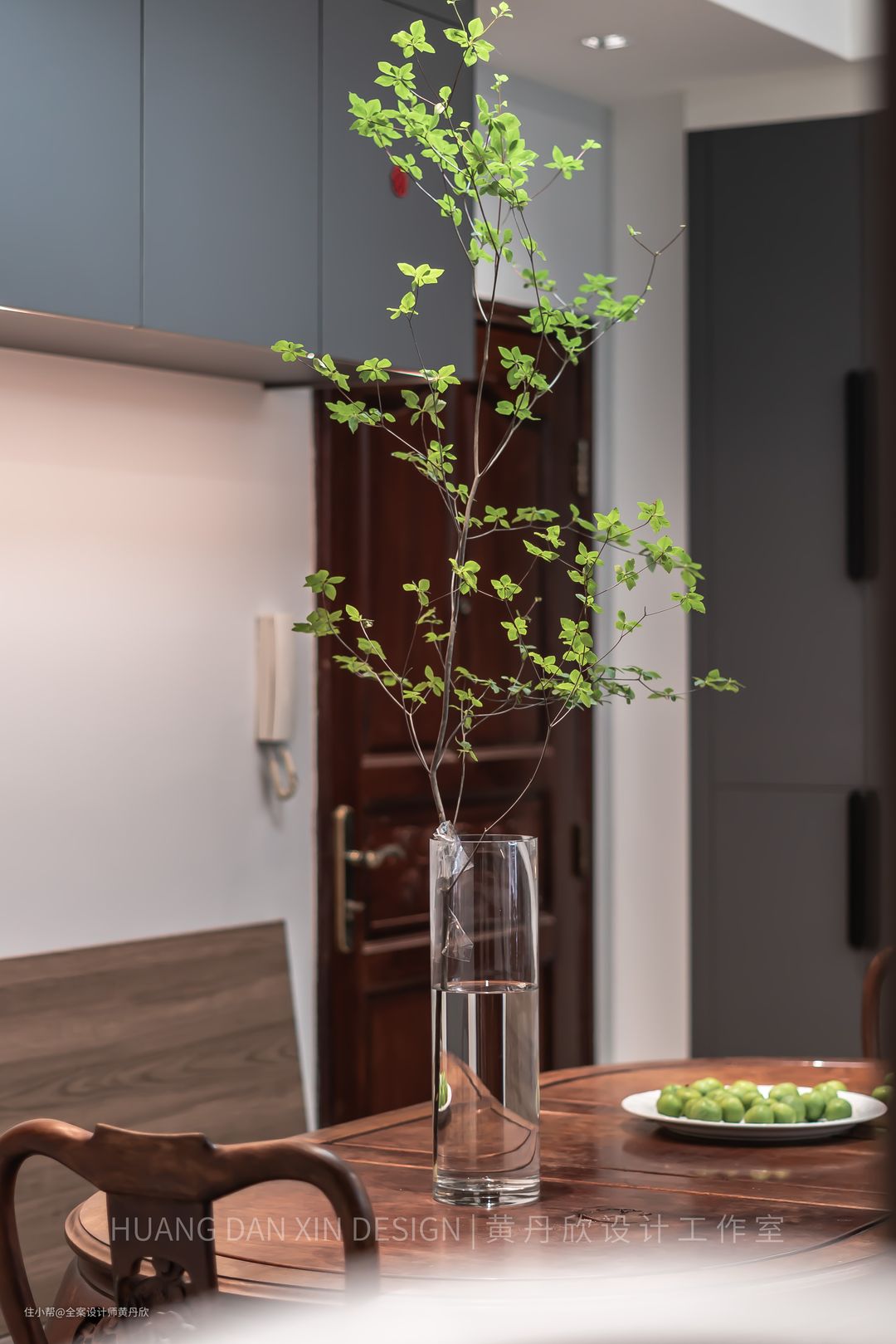 走廊处望向入户门角度。“吊钟”的树叶犹如花瓣,形态非常优美舒展,不动声色地提升了空间的气质。