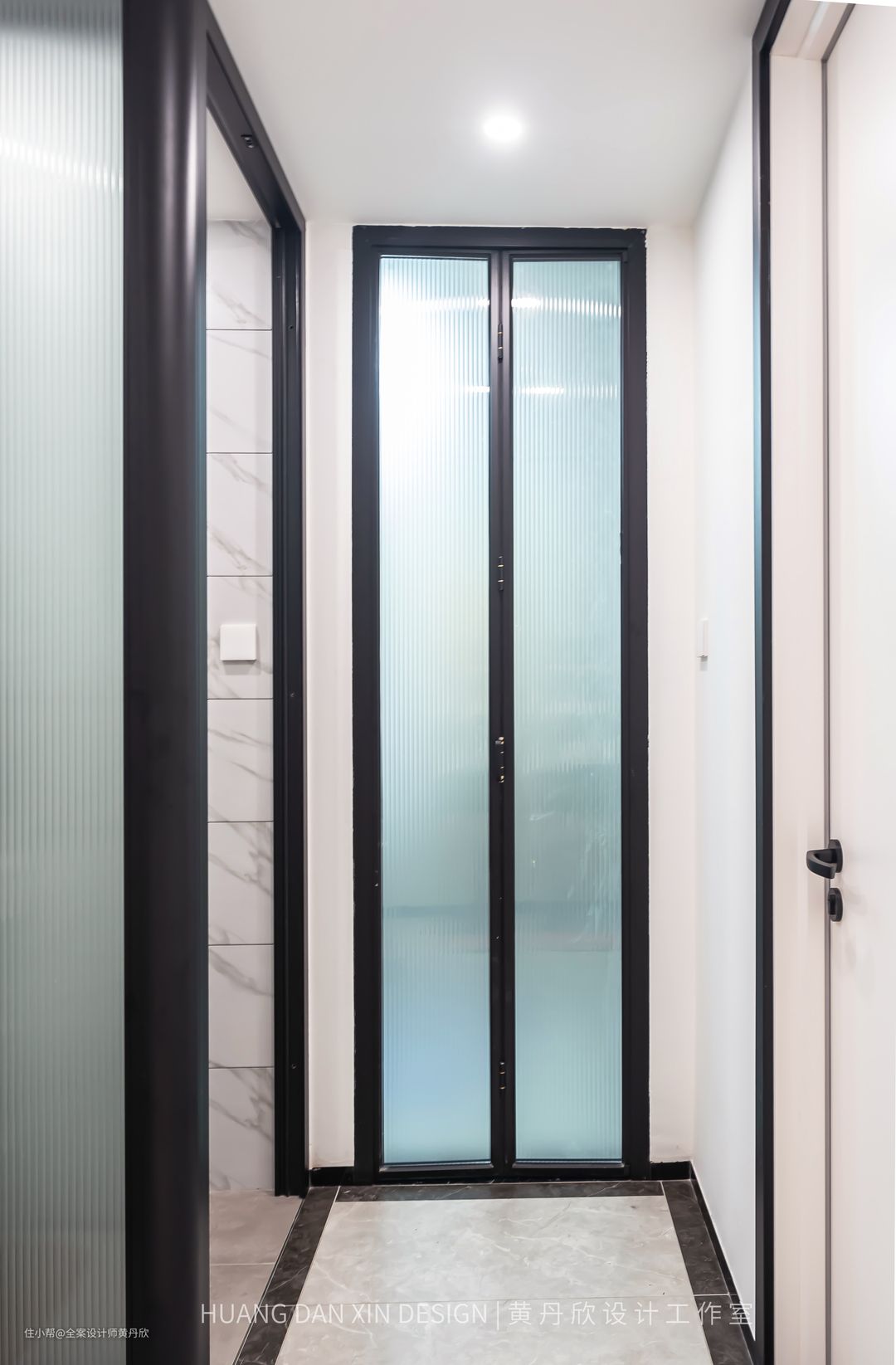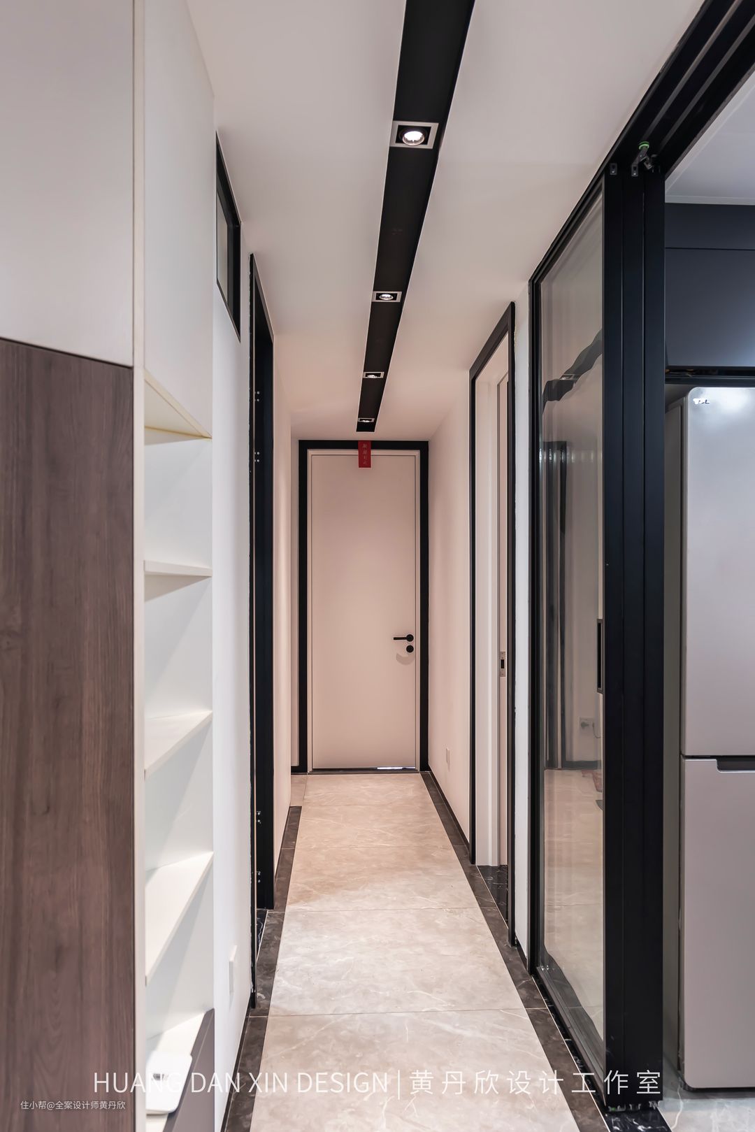 改造之后,走廊顶部做了吊顶,隐藏很乱的梁体,并且高度跟厨房控制成同等高度2400mm,延伸了视线,也不显得压抑,走廊看起来比之前要宽敞很多。走廊采用“勾边”的设计手法,所有的门洞高度都做到顶,并且门套线选择了黑色,地面走黑色波打线,踢脚线采用4cm的黑色瓷砖踢脚线,吊顶做了黑色的凹槽装防眩光射灯,指引性的线条的勾勒,使得走廊空间显得非常挺拔干净。