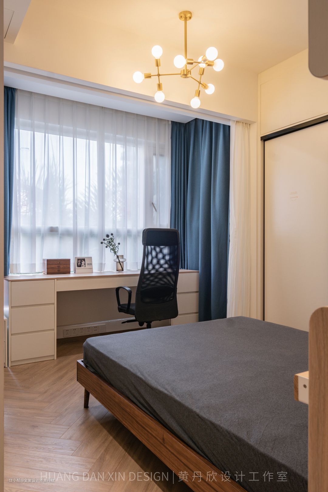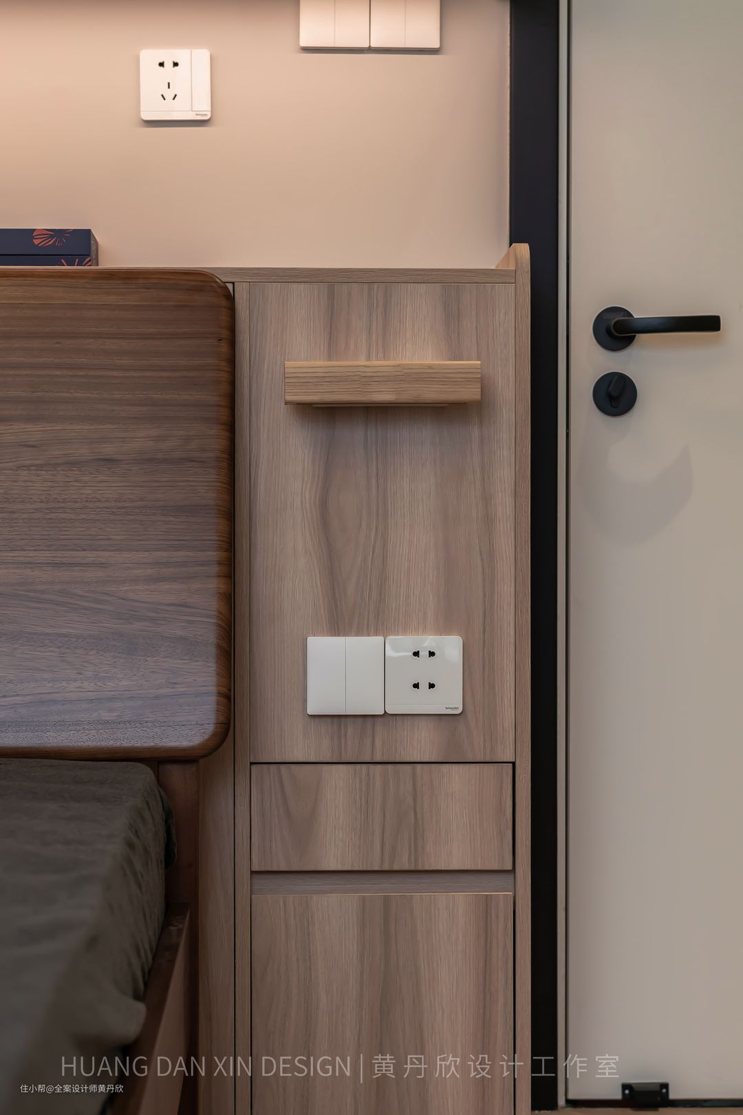 因为走道较窄,放床头柜会很拥挤,所以在床屏两侧做了小抽板,晚上可以放手机充电还有眼镜等杂物,小抽板下方还做了一个抽屉,相当于把床头柜和床屏柜整体化了。 结束语:房子是有生命力的,在屋主精心的呵护下,一定会越来越好。装修完新家,只是创造未来美好生活的第一步。相信在业主一家的慢慢经营中,软装会逐渐地变得丰富,“家”会变得越来越美,越来越有“他们的味道”。