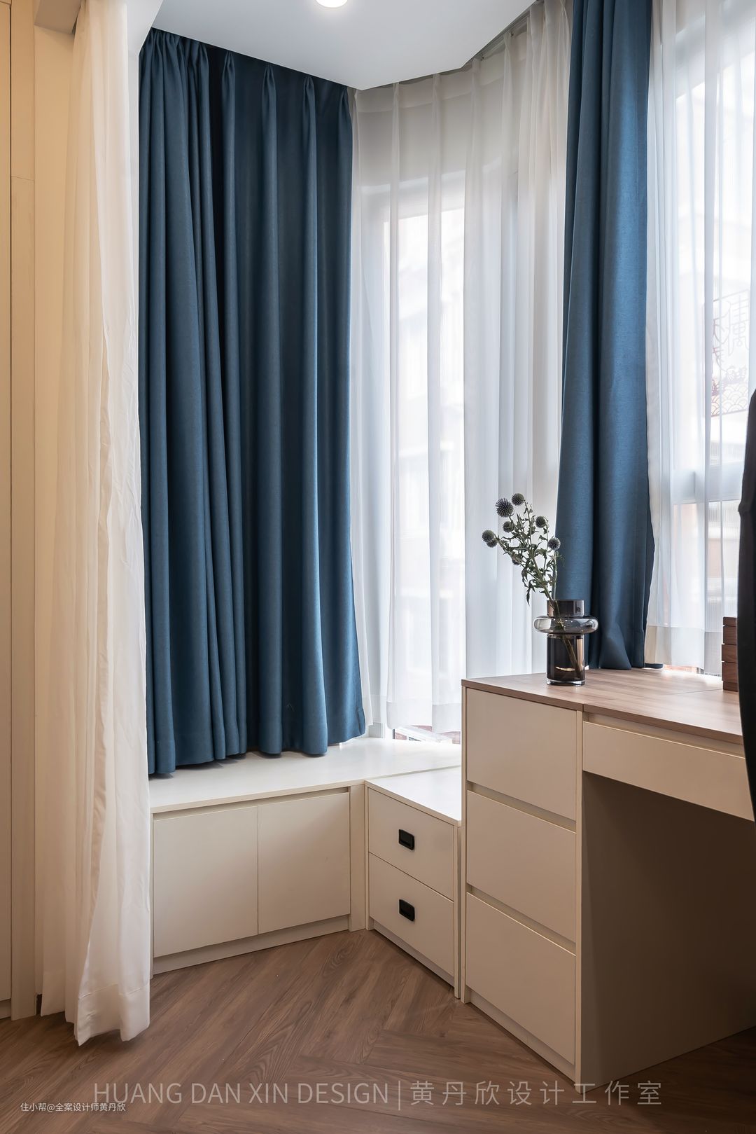 蓝色窗帘后面就是原本的排污管位置,现在这个位置成为房间的一个大件杂物收纳区,冬天的大衣不经常换洗,也可以收纳在里面。抽屉的厚度经过计算,可以舒舒服服地翘脚或者盘腿。