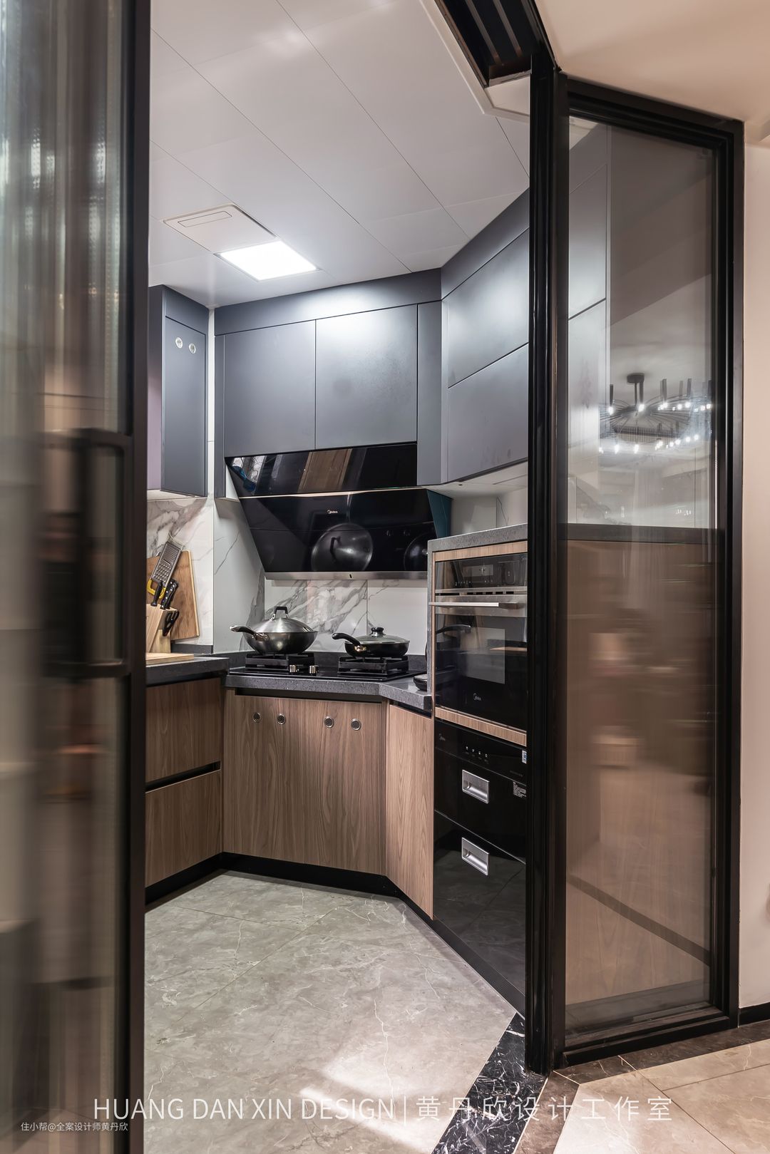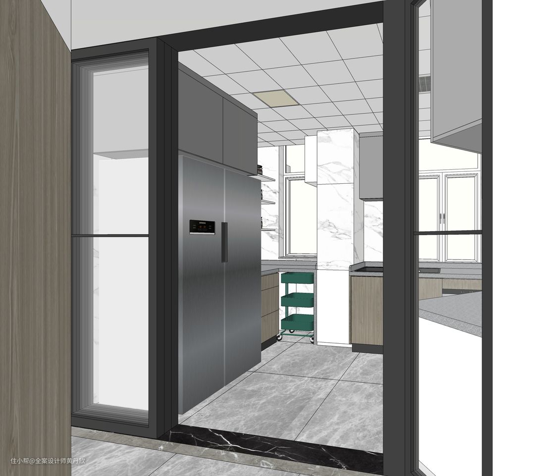 我在设计阶段就帮业主规划好了橱柜的布局,消毒碗柜,蒸烤箱,水槽式洗碗机还有双开门大冰箱都放进去,还有超多储物空间,采光也非常棒,顶部还配置了凉霸,对于每天都做饭的业主一家,真的好用太多了。