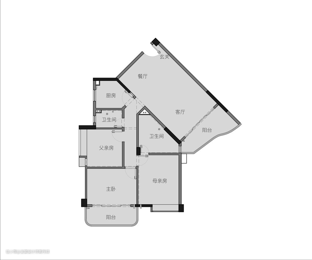 原始结构图,缺陷分析: 1.厨房狭小,且为5角形空间,无法满足日常使用需求; 2.公共卫生间狭小,没办法干湿分离; 3.没有玄关区域,开门见客厅; 4.主卧阳台配套阳台没有充分利用。 5.走廊宽度只有0.9米,且狭长,采光也差,另外从餐厅看过来的角度,走廊入口是一个尖角,影响观感。