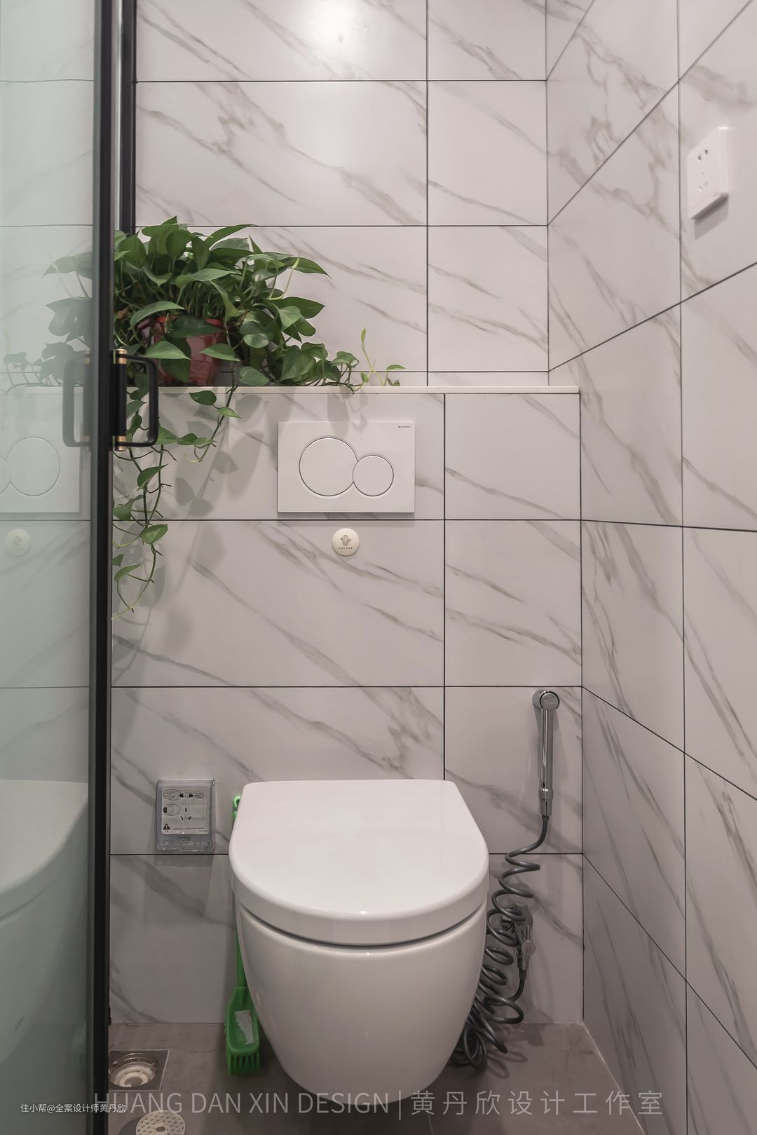 马桶间采用壁挂式马桶,没有卫生死角,并且预留了地漏,配合冲水枪,清洁非常方便。