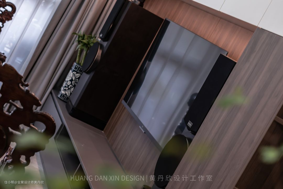 也是比较有年代感的音箱,刚好跟对面的灰色展示柜相互呼应。电视背后预埋了直径50mm的排水管,走线到地柜的开放格位置,开放格收纳电视盒子等物品,看不到插座和明线,非常清爽。