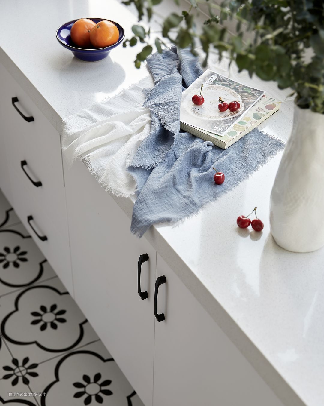 两间卧室的南侧外围是长达六米的宽景阳台,以黑白相间的拼花瓷砖铺底,绿植环绕,微风吹拂白色纱帘,满目阳光倾斜的姿态。窗外是老城区市井生活百态,屋内晨光如水,轻松闲适。