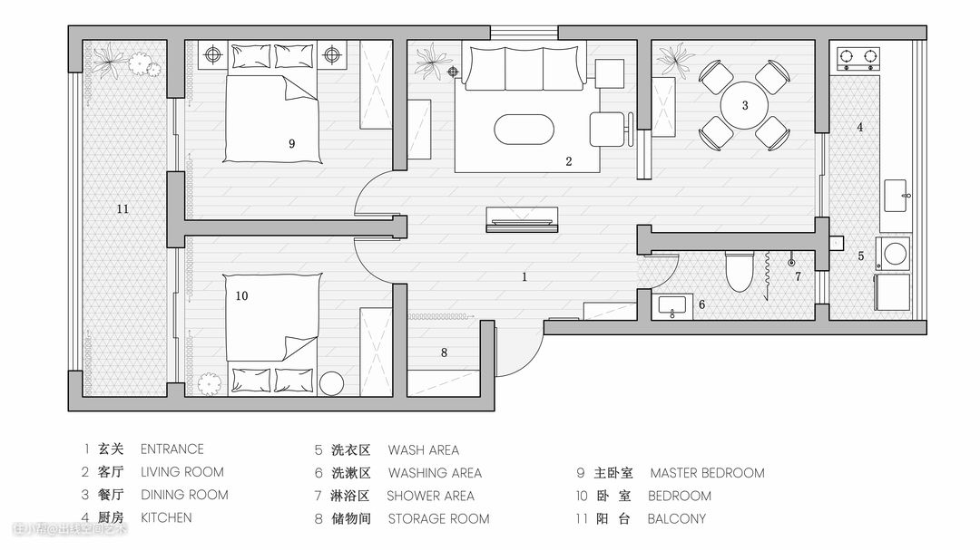 户型问题:属于空间较小但南北通透的格局。 原始布局:因陈旧不合理的装修,空间显得局促和昏暗。 方案改造:我们打通了两个卧室的阳台,拆掉无用的门联窗,将室内空间改造得更加开敞,让天光恣意挥洒在这个空间中。