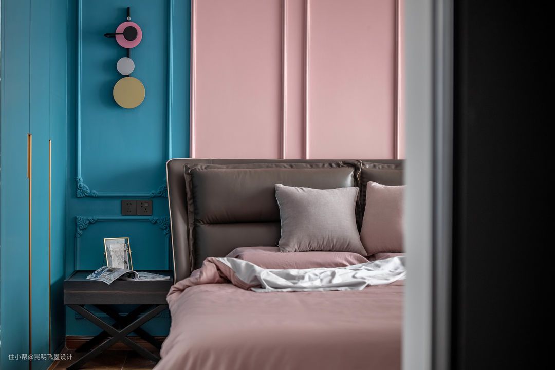 主卧室空间 主卧睡眠空间,我们采用了无主灯,线光源,点光源的灯光设计,让睡眠空间柔和。主卧的整体色调我们把从玄关就出现的“粉色”,客厅过渡的“粉色”,在这里找到归属地。粉色为这个空间的主色,为这个空间添加了几分柔度。而蓝色的点缀,又让这个空间与客厅未断联系。