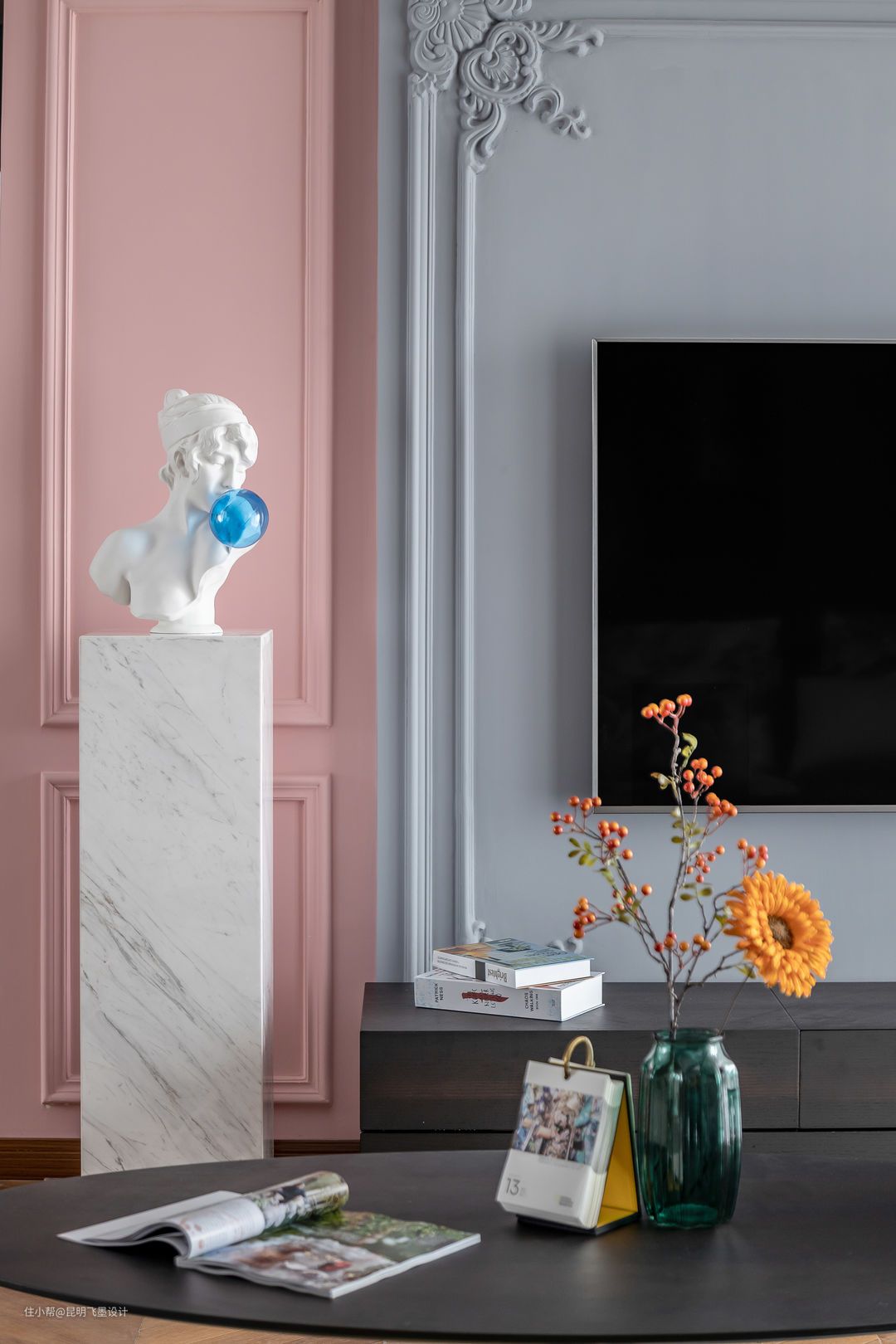 客厅区的窗帘选用了灰色为主布,粉色配布点缀,加上电视墙局部粉色乳胶漆呼应,让这个空间多点暖意,又与玄关处的粉色相互穿插。电视墙的石膏定制花型和顶面石膏角花相互呼应,配上左边的石材基座和石膏画像,让这个空间增添了一些艺术氛围。