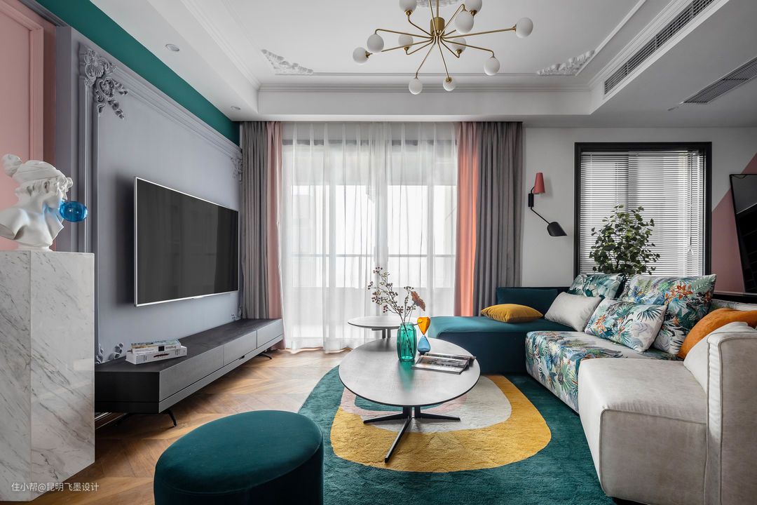客厅区的窗帘选用了灰色为主布,粉色配布点缀,加上电视墙局部粉色乳胶漆呼应,让这个空间多点暖意,又与玄关处的粉色相互穿插。电视墙的石膏定制花型和顶面石膏角花相互呼应,配上左边的石材基座和石膏画像,让这个空间增添了一些艺术氛围。