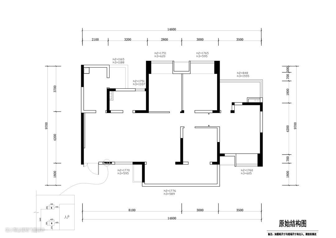 原始结构图 由于屋主目前独居,希望未来的家:1)餐厅空间可以有更多的可能性。 2)客厅公共空间想更为宽阔些,敞亮些,需要增加书房和画室空间。 3) 次卫生间门对着客厅,破坏了客厅的完整性,又不美观。 4)卧室空间功能性需要更为完整。 5)入户需要有玄关的感觉,整体需要足够做的储物空间。 6)整体色彩不受限。
